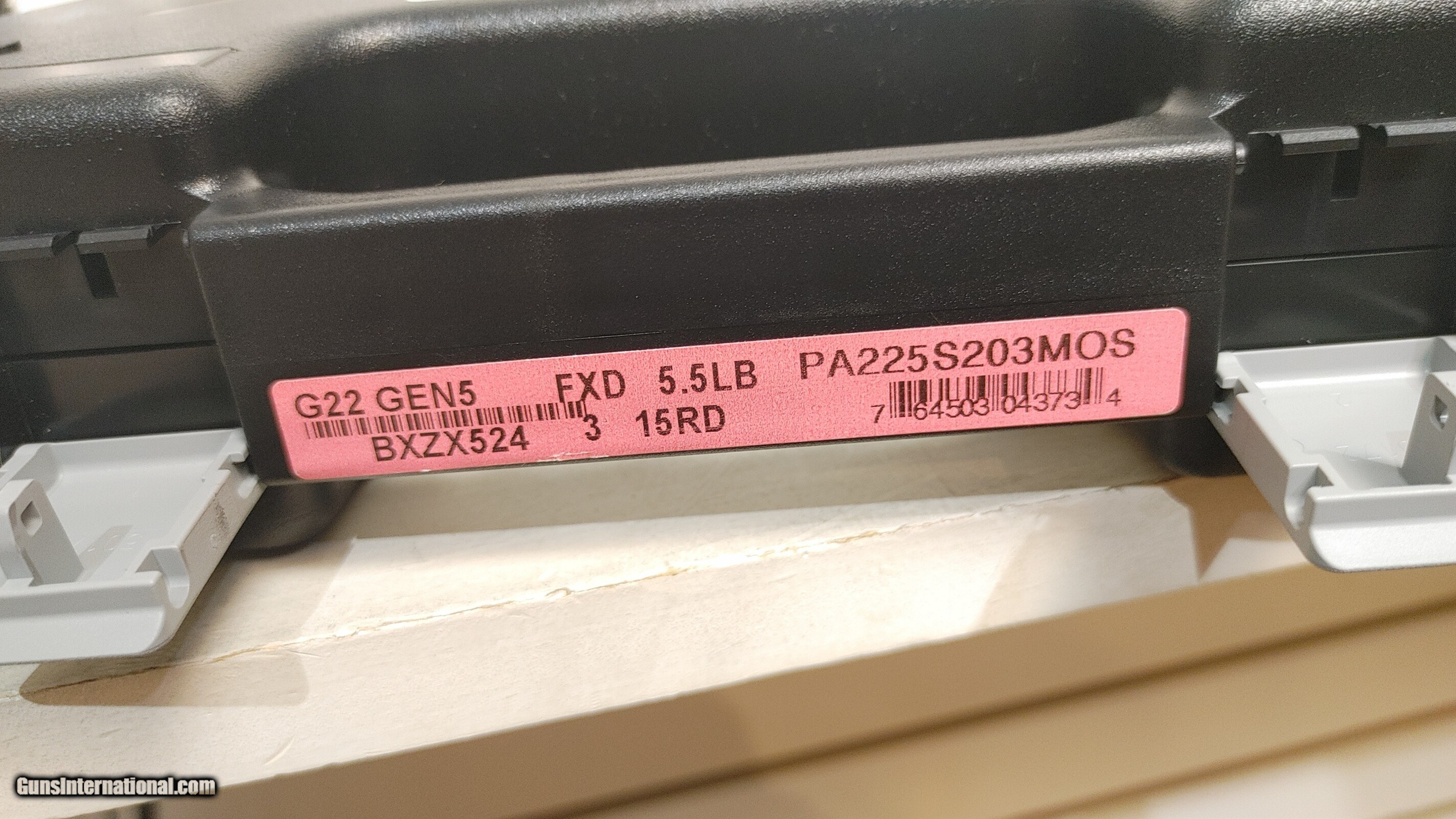 Description: new 22 G5 40SW 15RD MOS new in hard plastic case (CALIBER:40SW); (MAG CAPACITY:S+W); (GUN TYPE:PISTOL: SEMI-AUTO); (MODEL SERIES:22); (ACTION:SAFE ACTION); (CAPACITY:15+1); (FINISH:BLACK MATTE); (SIGHTS:FT: WHITE DOT RR: WHITE OUTLINE); (BARREL LENGTH:4.49); (OVERALL LENGTH:7.32); (FEATURES:INCLUDES ADAPTER PLATES TO MOUNT POPULAR OPTICS); (DEPT:HANDGUN) Buyer pays shipping Millers Gun Center Located in New Castle, Delaware "Home of TAX-Free shopping" No Credit Card Fees Send Gun international inquiry and then call 302-328-9747 to complete your purchase SOLD Serial Number: BXZX524 |