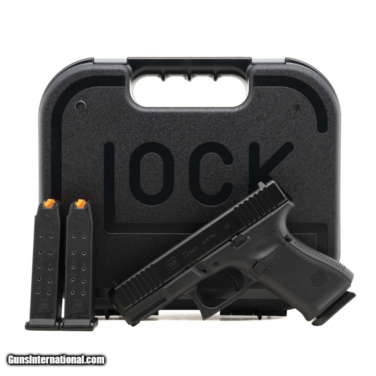 Description: " Glock, 23 GEN 5, striker fired, compact, 40 S&W, 4.02"" marksman barrel, polymer frame, matte finish, fixed sights, 13rd, 3 magazines, ambidextrous slide stop lever, flared mag well. NEW UPC: 764503043918 SOLD |