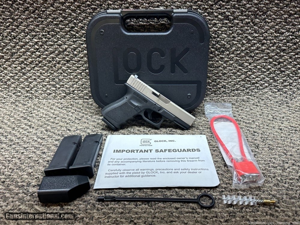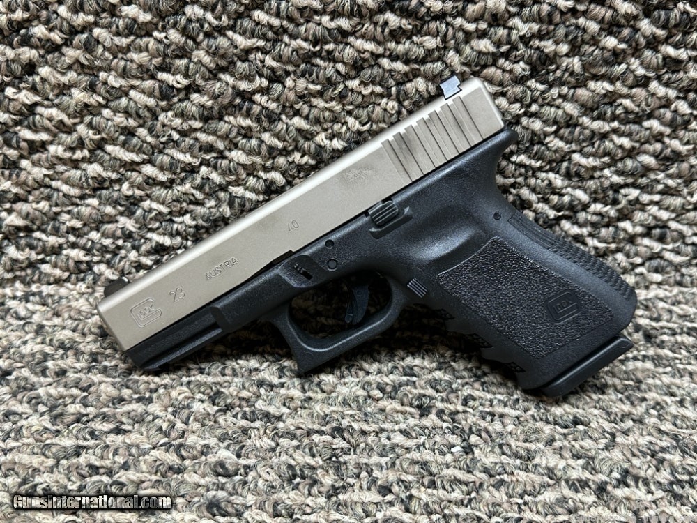 Description: Guns Listing ID: 1076481 This listing is for a USED Glock 23 40 S&W 4.02\" BBL Black Stainless 13+1 Trijicon Night Sights. This is a used gun, it has been fired and there will be residue present. This Glock 23 is chambered in 40 S&W, and the barrel is 4.02 inches long. This handgun has Trijicon night sights, a stainless-steel slide, rear slide serrations, an aftermarket grip cap, and an accessory rail. This Glock comes with the original box, three 13 round magazines, the owner’s manual, a speed loader, a cleaning rod, a bore brush, and a gun lock. There are spots of discoloration on both sides of the slide, as well as some scratches on the left side of the slide. The bore appears to be in good condition. This would be a great home defense or conceal carry handgun! SOLD Manufacturer: GLOCK Model: 23 Caliber Info: .40 S&W Condition: Used - Non-Certified Barrels: 4 BARREL Finish: STAINLESS |