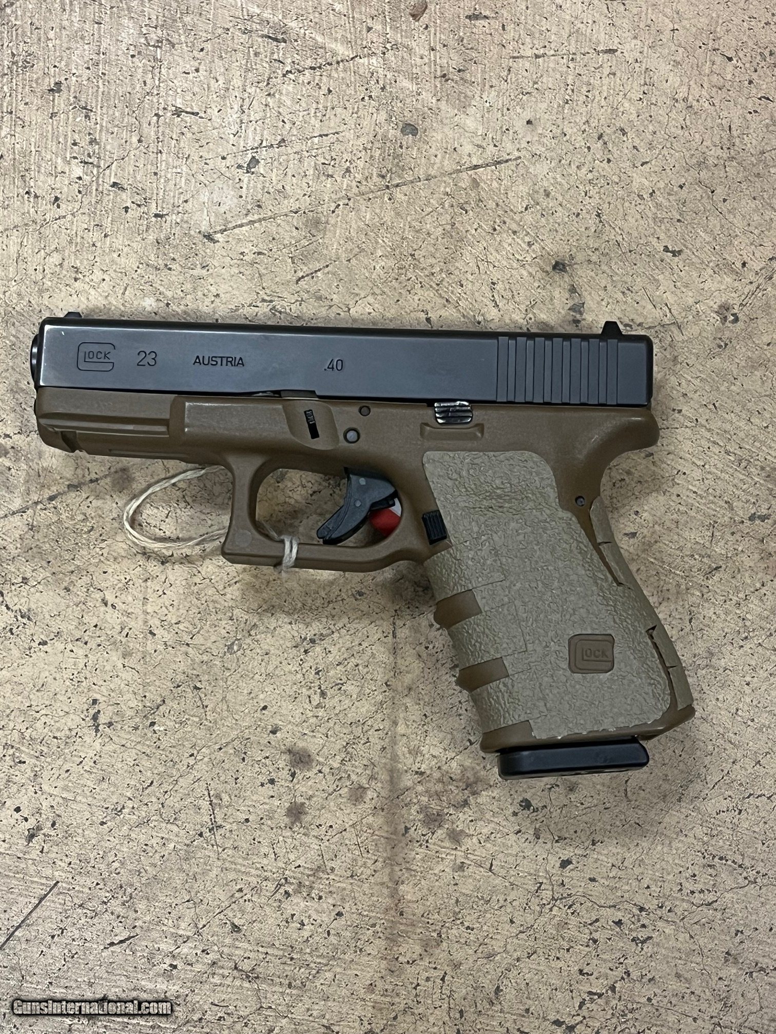 Description: Guns Listing ID: 476822 Glock 23 with fde frame and black slide has extra talon grip in fde one mag SOLD Manufacturer: GLOCK Model: 23 Condition: Used - Non-Certified Barrels: 4 Gauge Info: .40 S&W Finish: black/fde |