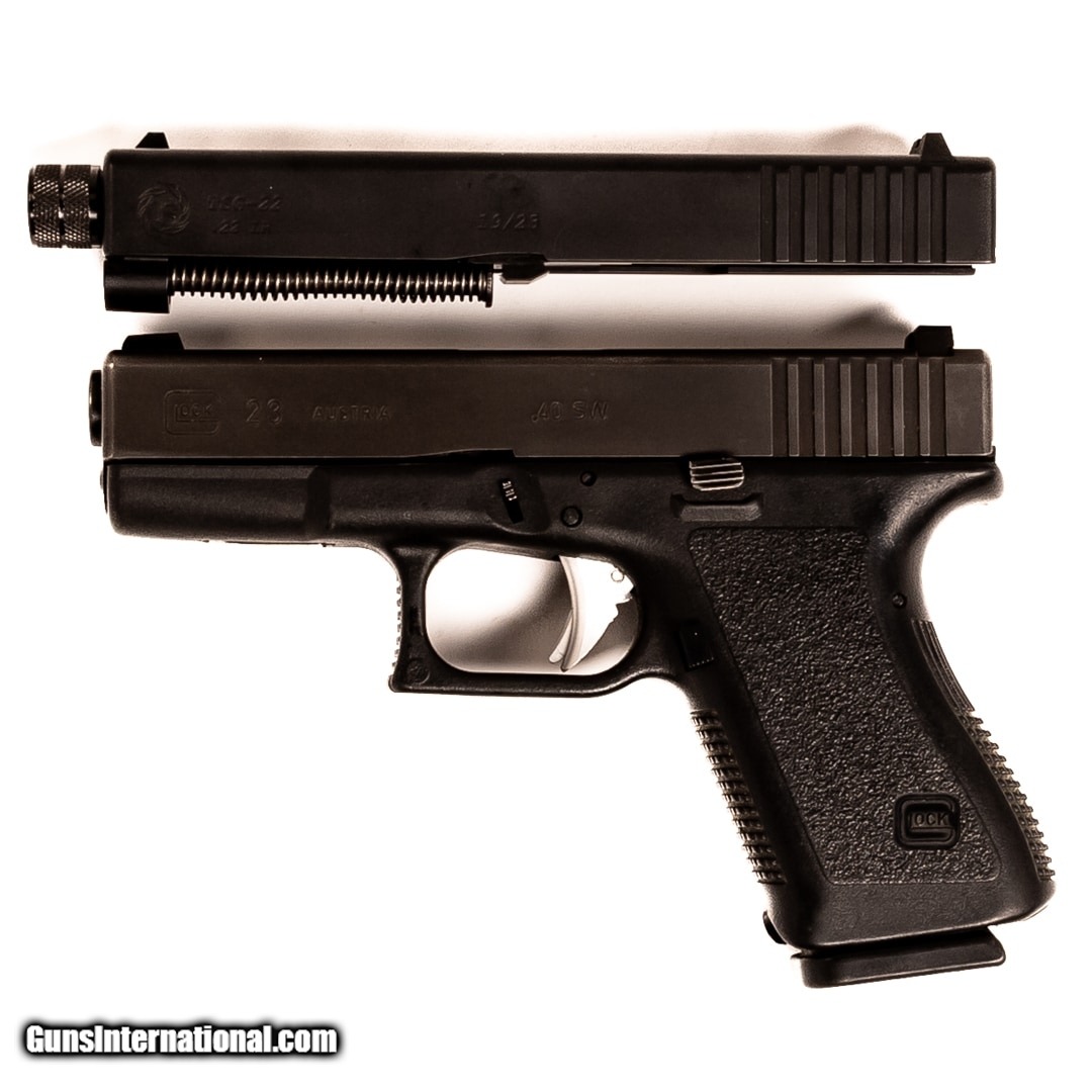 Description: Guns Listing ID: 739450 The Glock G23 is a polymer-framed pistol that offers unparalleled durability and reliability, even in adverse conditions. Crafted with a design that remains relatively lightweight, this pistol is popular as a service weapon and equally suited for self-defense. The pebbled grip is designed for minimal slippage and greater comfort, and to this end features a lined front and back strap and finger grooves. It also sports a Universal Glock Rail for easy mounting of accessories. This Glock 23 Gen 2 features an aftermarket trigger. Purchase includes one 13-round magazine, two 15-round magazines, one 23-round magazine, a Don Hume leather dual mag carrier, a right-handed IWB Kydex holster, and a mag carrier. It also comes with a Tactical Solutions .22 conversion kit with the manual and one 10-round .22 magazine. Get the best bang for your buck when you get a Certified Used Firearm . When you see the Certified Used stamp on any of our firearms, you can be confident that you’re getting exactly what you want – a gun only in very good to excellent condition and held to the highest quality standard. All Certified Used Guns come with a ‘no questions asked’ return policy . PLUS, ALL CERTIFIED USED GUNS SHIP FREE! SOLD Manufacturer: GLOCK Model: 23 Caliber Info: .40 S&W Condition: Used - Certified Barrels: 4 BARREL Finish: BLACK |