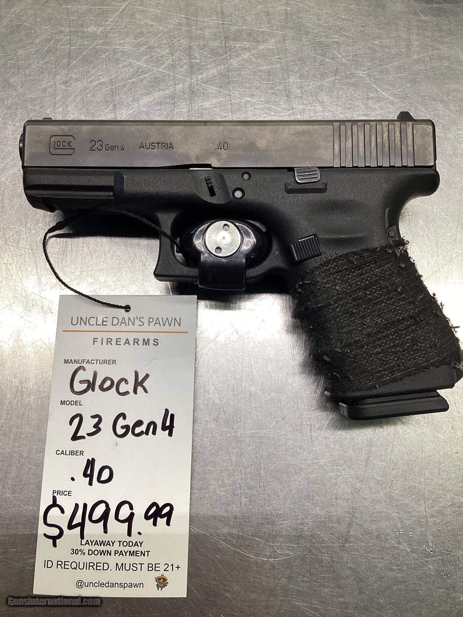 Description: Guns Listing ID: 608510 Minor flaws No box or extra magazines Glock 23gen4 Manufacturer: GLOCK Model: G23 GEN 4 Caliber Info: .40 CALIBER Condition: Used - Non-Certified Barrels: 5" BARREL Action: SEMI AUTOMATIC Finish: black Price: $499.99 Contact Seller |