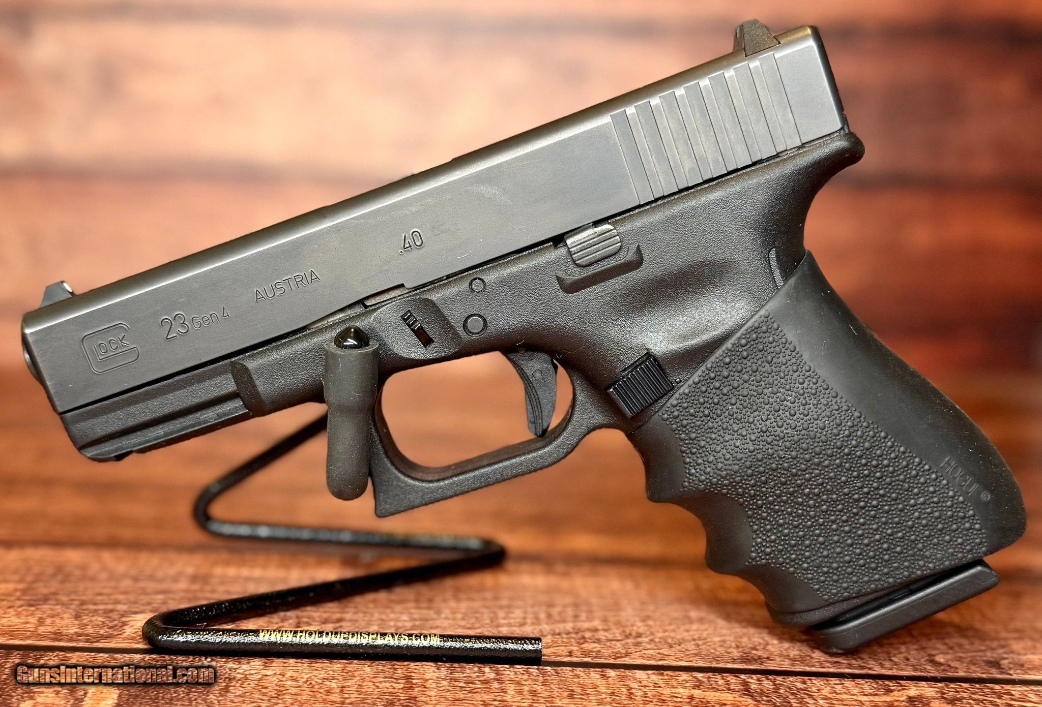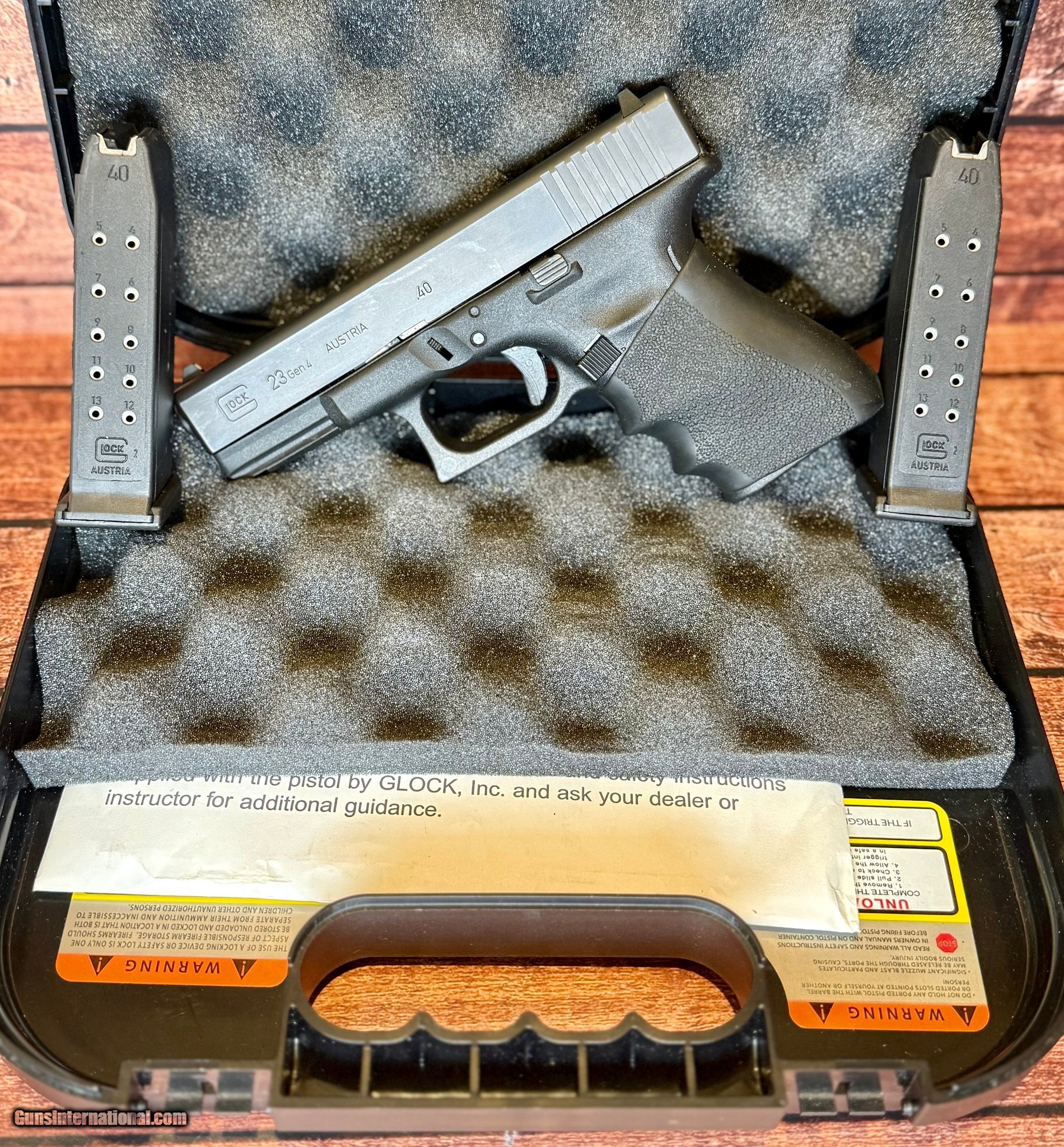 Description: Guns Listing ID: 565515 The Glock 23 Gen4, a semi-automatic pistol that perfectly balances power and size, making it a versatile choice for both law enforcement and civilian shooters. This compact .40 S&W caliber firearm is renowned for its reliability and performance, both in self-defense scenarios and at the range. Collectors and enthusiasts alike will appreciate this piece, which is in excellent condition, exhibiting only a few signs of prior use. Its clean bore and sharp rifling are testament to its quality and care. The Glock 23 Gen4 comes with a robust black polymer frame, featuring ergonomic finger grooves and texturing for a secure grip. The modular backstrap system ensures comfort for all hand sizes, while the dual recoil spring assembly reduces felt recoil and enhances durability. You‚ll receive two (2) 13-round magazine, giving you ample capacity for any situation. Also included is a Glock hard plastic case with paperwork. Firearm has also been fitted with Hogue grips. Owning the Glock 23 Gen4 means having a trusted companion that offers unmatched reliability and versatility. Its compact size and powerful caliber make it an ideal choice for those who demand performance without compromise. Whether for collection, personal defense, or competitive shooting, this pistol stands out as a reliable and efficient option. Don‚t miss the opportunity to add this exceptional firearm to your arsenal. Specifications: Manufacturer: Glock Model: 23 Submodel: Gen4 Caliber: .40 S&W Overall Condition: Excellent condition, showing only faint signs of any prior use or handling Bore Overall Condition: Excellent - Clean finish. Bore Rifling: Excellent Rifling - Sharp lands and grooves Action: Striker Capacity: 13+1 Barrel Length: 4.02\" Finish: Black Country of Origin: United States SOLD Manufacturer: GLOCK Model: G23 GEN 4 Caliber Info: .40 S&W Condition: Used - Non-Certified Barrels: 4.02" BARREL Action: SEMI AUTOMATIC Finish: black |