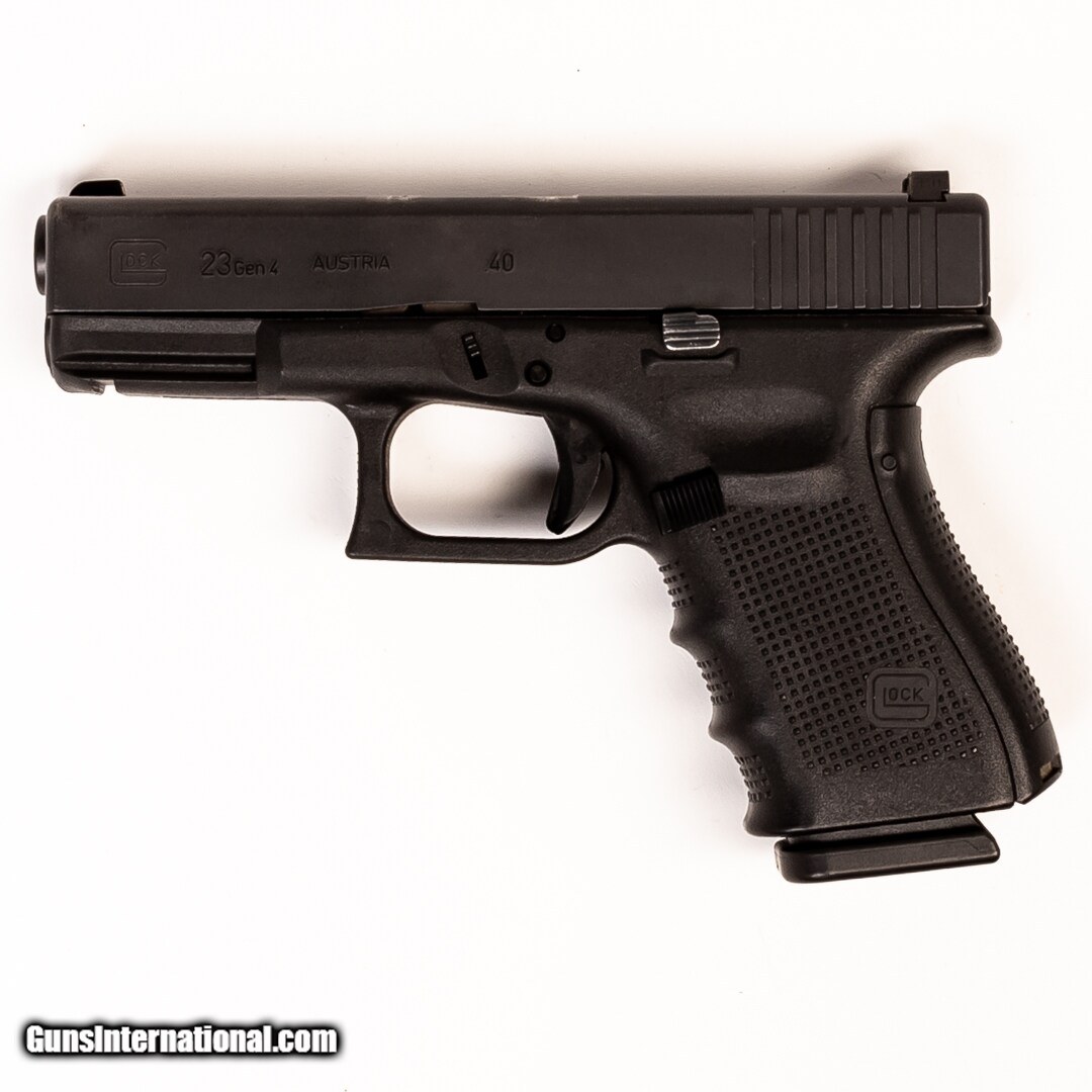 Description: Guns Listing ID: 545051 The Glock G23 puts controllable power into a smaller-sized package. It is well-suited for law enforcement and security personnel and is easily concealable, making it a top choice for self-defense. The Glock 23 is made with Glock‚‚s famous polymer frame, and the Universal Glock Rail offers easy mounting of accessories. Stippled grips with finger grooves offer a comfortable and secure grasp. This G23 Gen 4 includes the original case, manual, and two 13-round magazines. Overall, it‚‚s in very good condition, with carry wear/damage. SOLD Manufacturer: GLOCK Model: G23 GEN 4 Caliber Info: .40 S&W Condition: Used - Certified Barrels: 4 BARREL Finish: BLACK |
