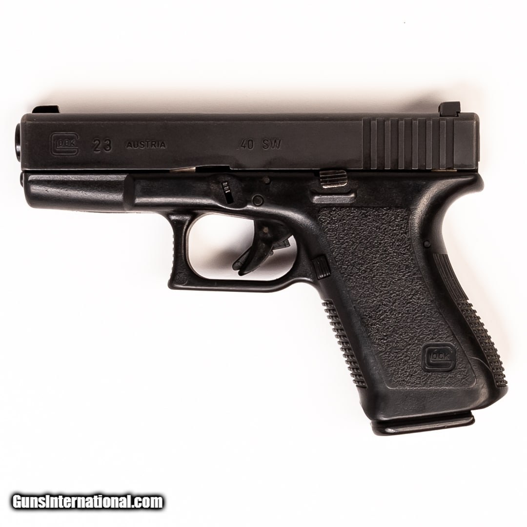Description: Guns Listing ID: 482803 The Glock G23 is a semi-automatic handgun built on a polymer frame. It offers unparalleled durability and reliability, even in adverse conditions. Chambered in 40 S&W with a design that remains relatively lightweight, this pistol is popular as a service weapon and equally suited for self-defense. The pebbled grip is designed for minimal slippage and greater comfort, and to this end features a lined front and back strap and finger grooves. It also sports a Universal Glock Rail for easy mounting of accessories. This model sports a laser-printed back plate featuring a wheel with wings. One 13-round magazine is included. SOLD Manufacturer: GLOCK Model: G23 GEN2 Caliber Info: .40 S&W Condition: Used - Certified Barrels: 4 BARREL Finish: BLACK |