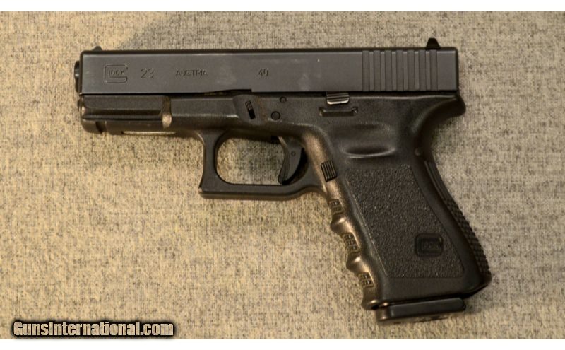 Description: This is a pre-owned Glock model 23 in .40 Smith & Wesson SOLD Caliber Info: .40 S&W Metal Condition: Very good with a few small scratches and a few small rub marks Wood Condition: Very good with slight handling marks Bore Condition: Clean with bright lands Barrels: 4 Stock: Textured polymer Weight: 1.5 Lbs. Sights: Dot front, white outline rear Extras: Comes with three 13 round magazines Item Location: Glendale, AZ |