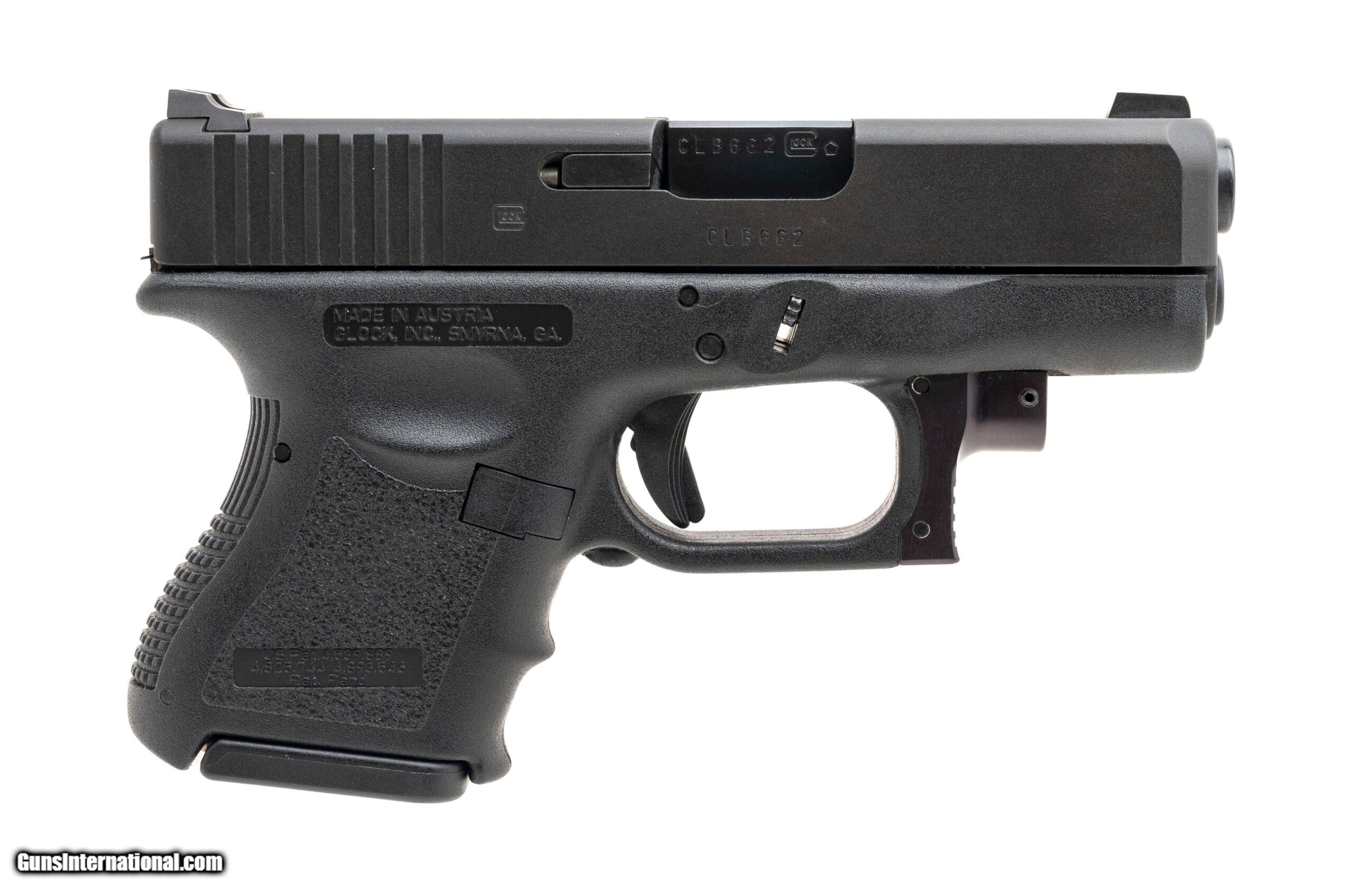 Description: "SN: CLB662. Modern production, 9mm with an 3.43"" barrel. Bore is bright with strong rifling. Sub-compact striker fired pistol with night sights and Crimson Trace laser. nDLC finish is very good. Polymer frame is excellent. Overall condition is very good. SOLD |