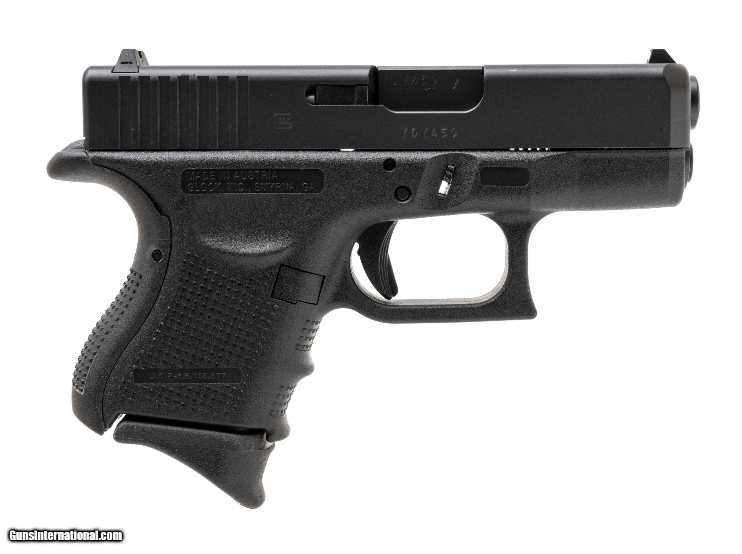 Description: "SN: YDY459. Modern production. Polymer-frame subcompact handgun made by Glock. 3"" barrel chambered for 9x19mm. Great overall condition with small handling marks in the nDLC slide finish. Comes with two spare magazines. SOLD |