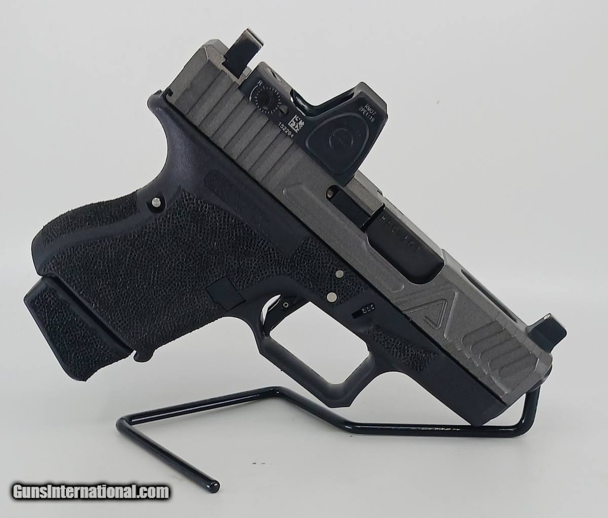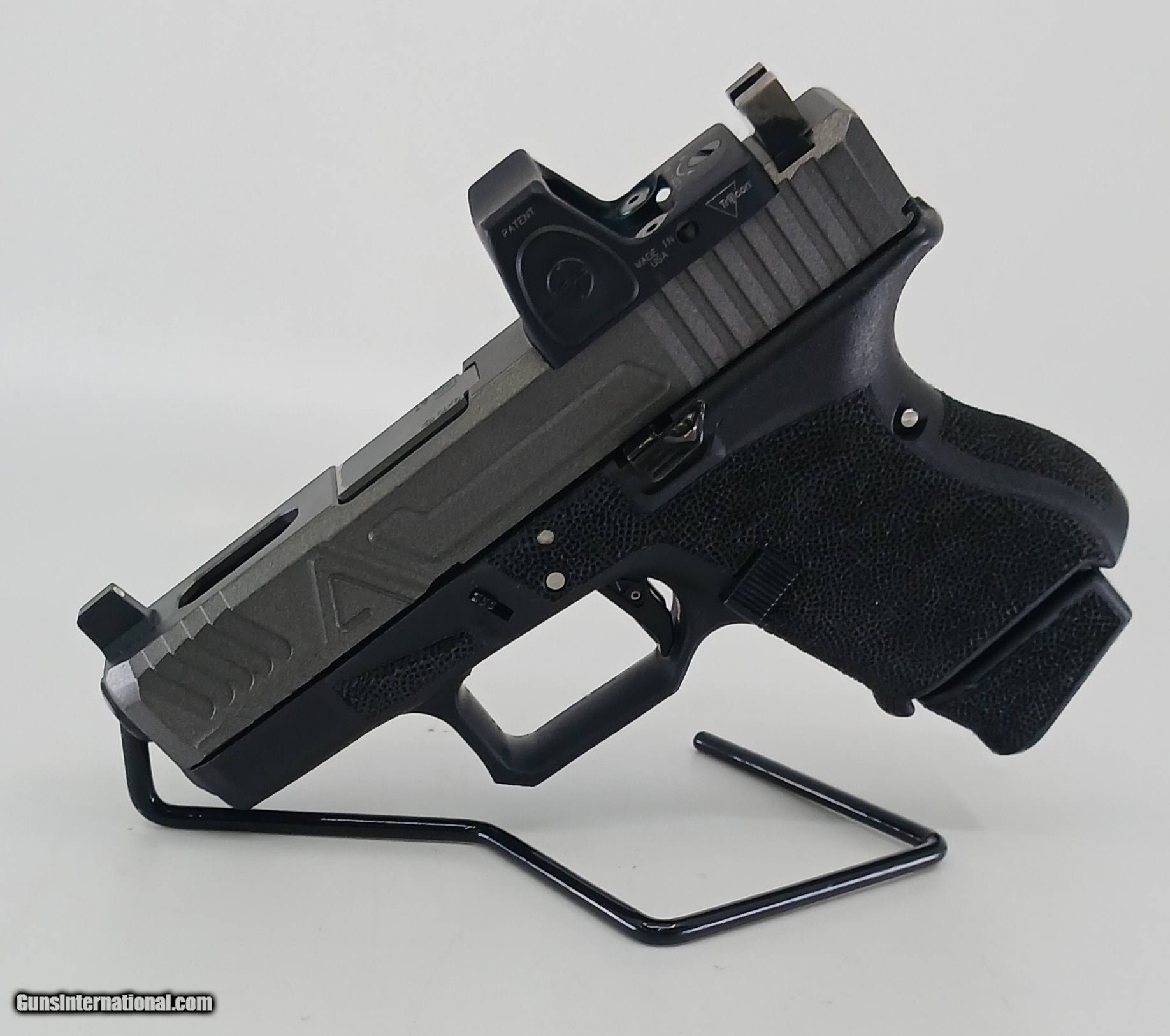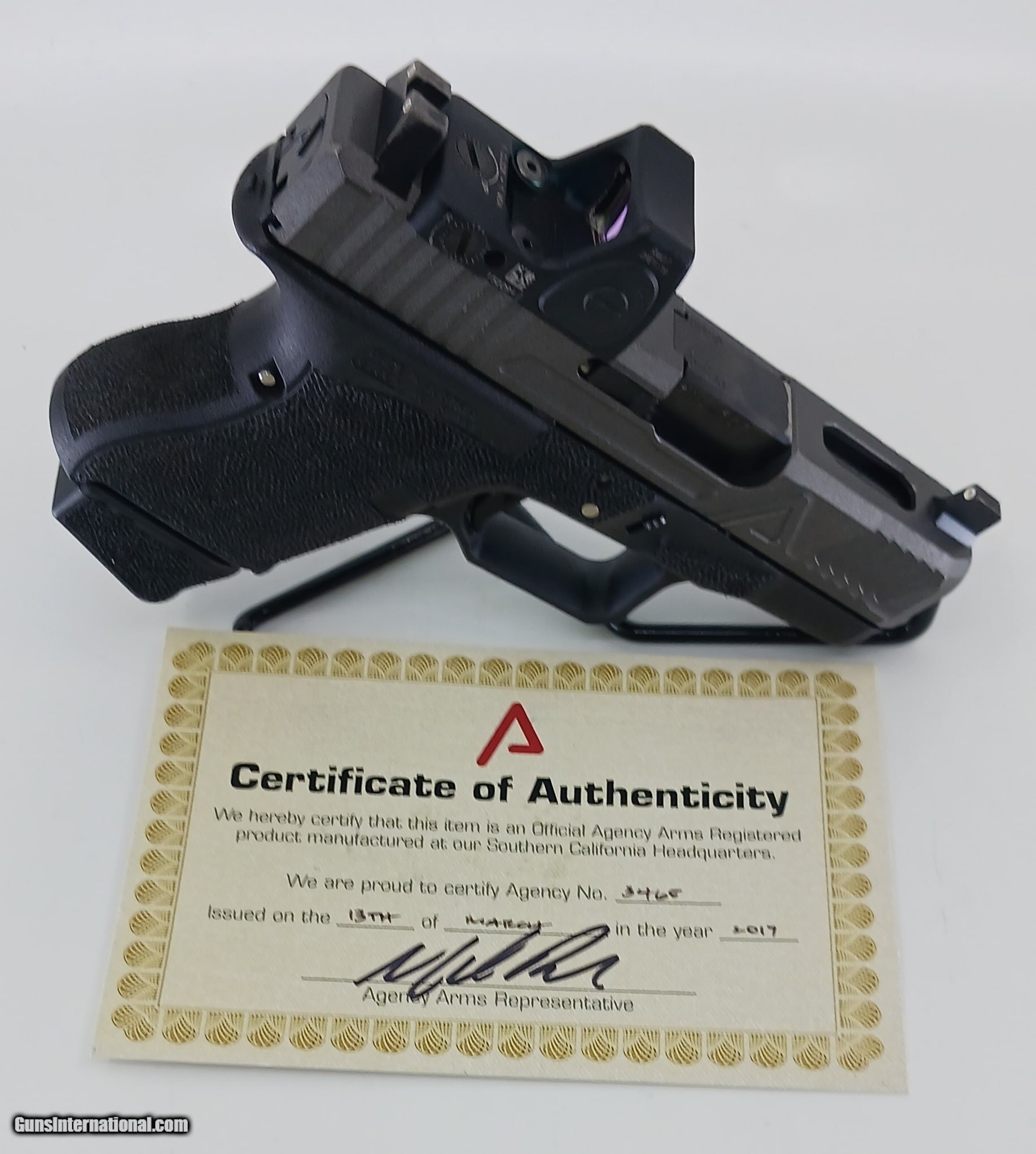 Description: Guns Listing ID: 558383 Agency Arms Glock 26 build. 1-10 round magazine 1-10 round magazine with +2 base plate. complete Agency build with certificate of authenticity. Trijicon RMR rm07 SOLD Manufacturer: AGENCY ARMS Model: 26 Caliber Info: 9MM LUGER (9X19 PARA) Condition: Used - Non-Certified Barrels: 34 BARREL Finish: GRAY CERAKOTE |