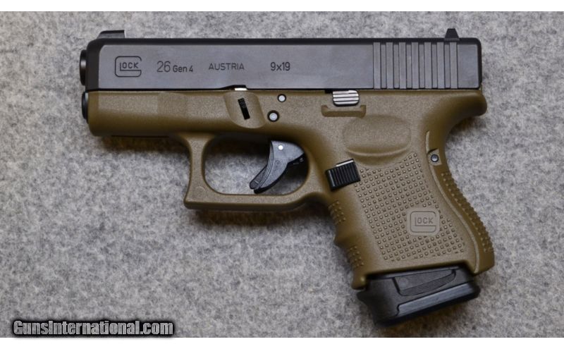 Description: Glock, Model 26 Gen 4 Flat Dark Earth Two-Tone Semi-Auto Pistol, 9X19mm Parabellum with ten shot magazine SOLD Caliber Info: 9mm Metal Condition: Like new with very light handling and wear marks Wood Condition: Like new with very light handling marks Bore Condition: Like new bright shinny rifling with very light wear marks Barrels: 3.42 inch Triggers: Striker fire Stock: Black polymer textured grips Weight: 20 ounce Sights: Replaceable white outline square groove rear sight and dot square blade front sight Extras: With Glock black plastic case, two extra ten shot magazines, speed loader, four back straps and owner manual Item Location: Hazelwood, MO |