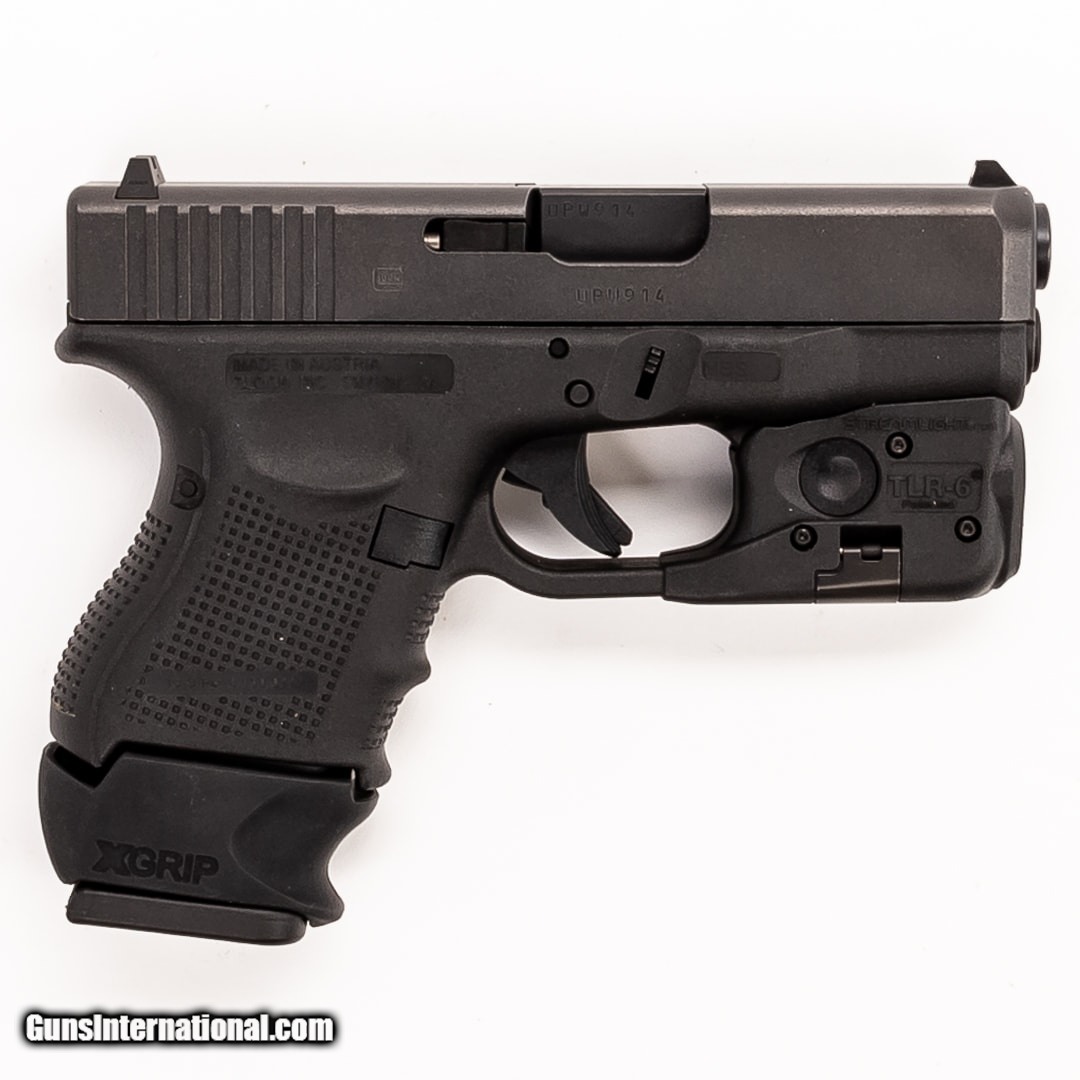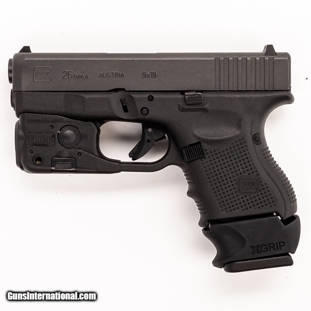 Description: Guns Listing ID: 625101 Also known as the \"Baby Glock,\" the Glock 26 is one of America‚‚s most popular concealed carry options. This sub-compact pistol is built on the company‚‚s signature lightweight polymer frame with rough texture technology for added durability. The Gen 4 model sports an aggressively textured grip and finger grooves to ensure a secure grasp through every shot. This G26 Gen 4 is equipped with a TLR-6 light. Purchase includes the original case, one 10-round magazine, two 12-round magazines with pinky extensions, two 15-round magazines with xgrips, and a loade SOLD Manufacturer: GLOCK Model: 26 GEN4 Caliber Info: 9MM LUGER (9X19 PARA) Condition: Used - Non-Certified Barrels: 3.4 BARREL Finish: BLACK |