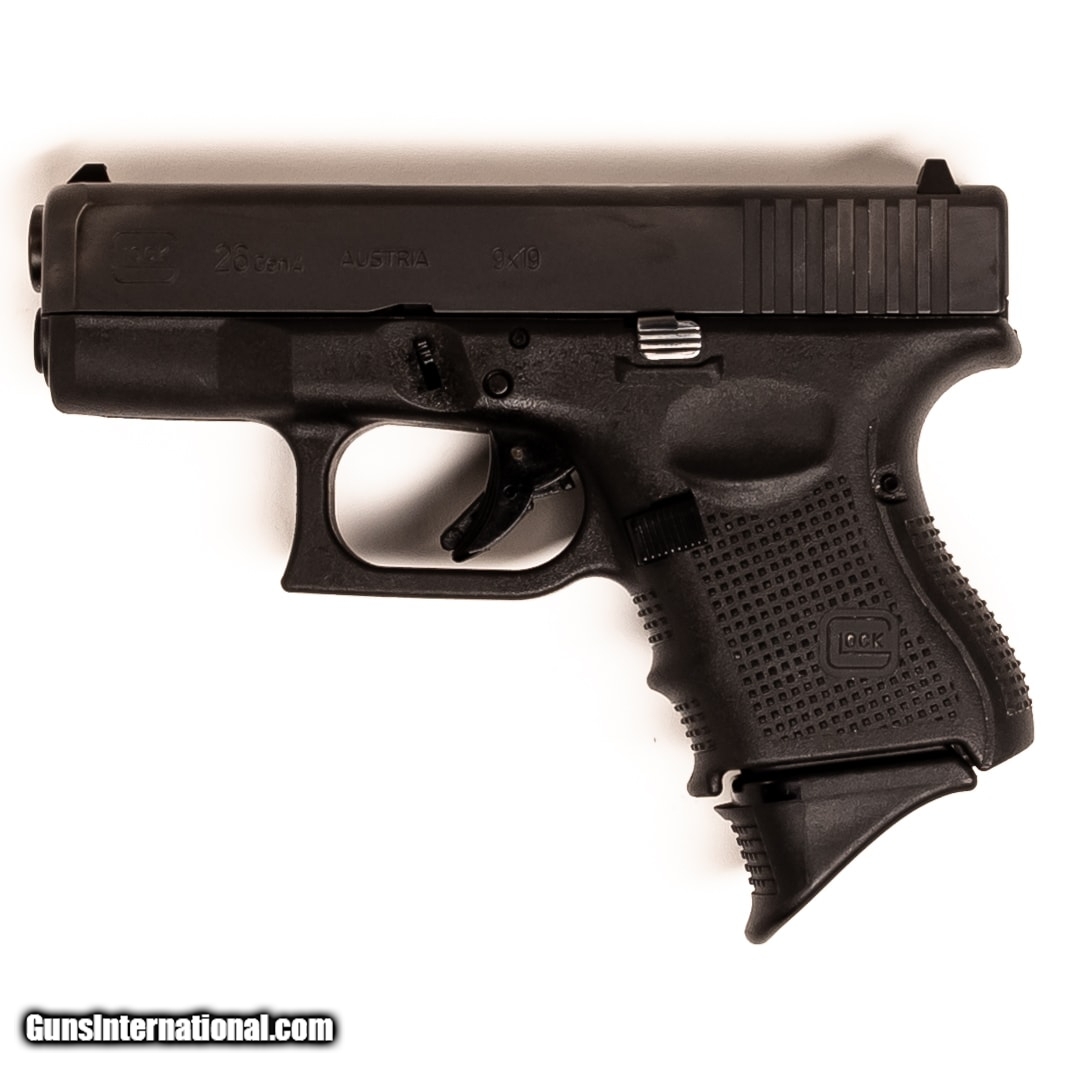 Description: Guns Listing ID: 642089 Also known as the \"Baby Glock,\" the Glock 26 is one of America‚‚s most popular concealed carry options. This sub-compact pistol is built on the company‚‚s signature lightweight polymer frame with rough texture technology for added durability. The Gen 4 model sports an aggressively textured grip and finger grooves to ensure a secure grasp through every shot. This G26 Gen 4 includes three 10-round magazines with grip extension. Get the best bang for your buck when you get a Certified Used Firearm . When you see the Certified Used stamp on any of our firearms, you can be confident that you’re getting exactly what you want – a gun only in very good to excellent condition and held to the highest quality standard. All Certified Used Guns come with a ‘no questions asked’ return policy . PLUS, ALL CERTIFIED USED GUNS SHIP FRE SOLD Manufacturer: GLOCK Model: 26 GEN4 Caliber Info: 9MM LUGER (9X19 PARA) Condition: Used - Certified Barrels: 3.4 barrel Finish: BLACK |