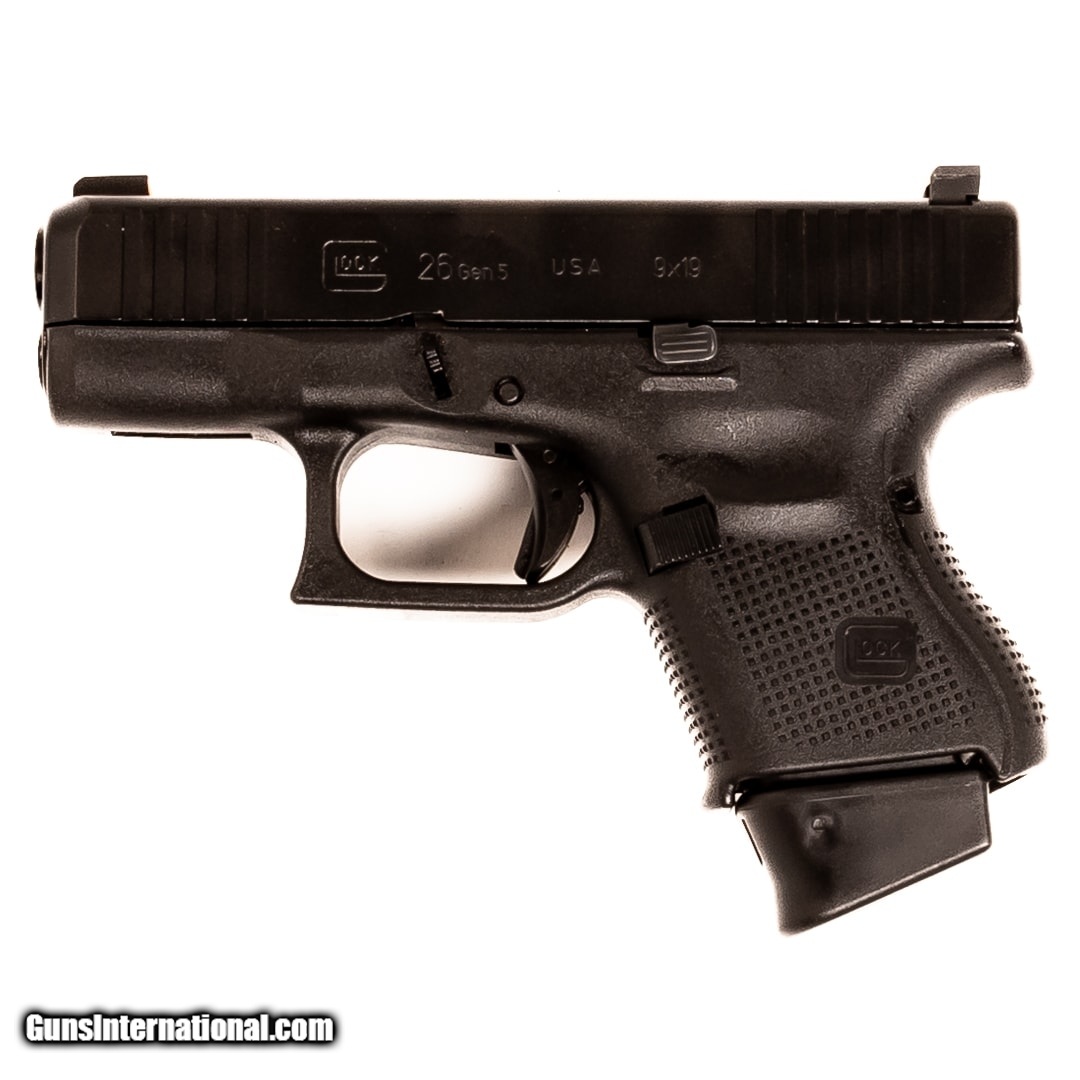 Description: Guns Listing ID: 671110 Also known as the \"Baby Glock,\" the Glock 26 is a sub-compact, semi-automatic handgun that‚‚s highly accurate and dependable. It has remained one of the most popular carry options since its initial introduction. In addition to offering Glock‚‚s signature polymer frame, features include a stippled grip, flared magwell, and ambidextrous slide stop levers. This G26 Gen 5 is equipped with XS Tritium night sights. It includes the original case, manual, two 10-round magazines, three 12-round magazines, backstraps, and a loader. Get the best bang for your buck when you get a Certified Used Firearm . When you see the Certified Used stamp on any of our firearms, you can be confident that you’re getting exactly what you want – a gun only in very good to excellent condition and held to the highest quality standard. All Certified Used Guns come with a ‘no questions asked’ return policy . PLUS, ALL CERTIFIED USED GUNS SHIP FRE SOLD Manufacturer: GLOCK Model: 26 GEN5 Caliber Info: 9MM LUGER (9X19 PARA) Condition: Used - Certified Barrels: 3.4 barrel Finish: BLACK |