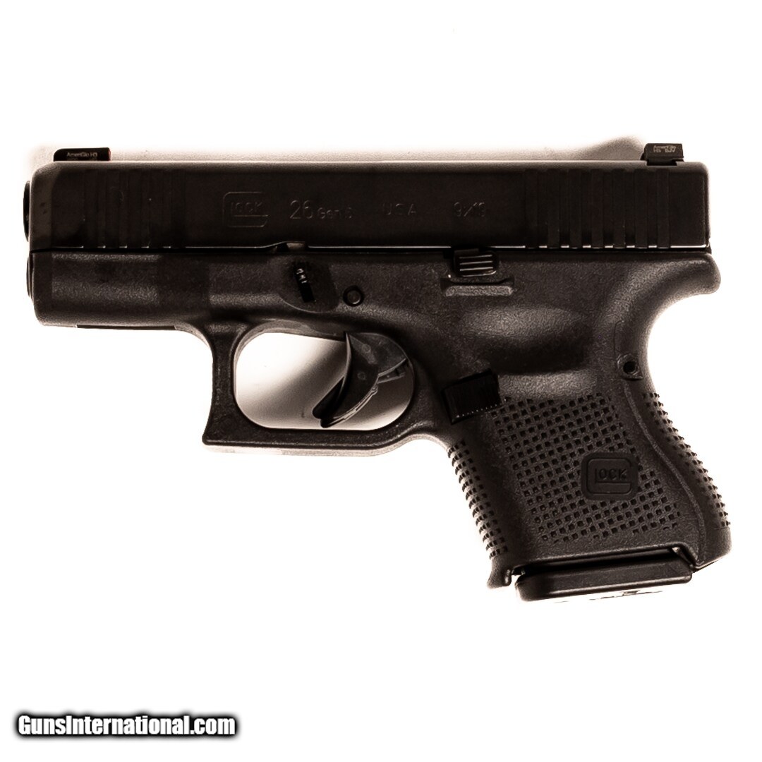 Description: Guns Listing ID: 807964 Also known as the \"Baby Glock,\" the Glock 26 is a sub-compact, semi-automatic handgun that‚‚s highly accurate and dependable. It has remained one of the most popular carry options since its initial introduction. In addition to offering Glock‚‚s signature polymer frame, features include a stippled grip, flared magwell, and ambidextrous slide stop levers. This G26 Gen 5 includes the original case, manual, four 10-round magazines, one 12-round magazine, backstraps, and a loader. Get the best bang for your buck when you get a Certified Used Firearm . When you see the Certified Used stamp on any of our firearms, you can be confident that you’re getting exactly what you want – a gun only in very good to excellent condition and held to the highest quality standard. All Certified Used Guns come with a ‘no questions asked’ return policy . PLUS, ALL CERTIFIED USED GUNS SHIP FRE SOLD Manufacturer: GLOCK Model: 26 GEN5 Caliber Info: 9MM LUGER (9X19 PARA) Condition: Used - Certified Barrels: 3.4 BARREL Finish: BLACK |