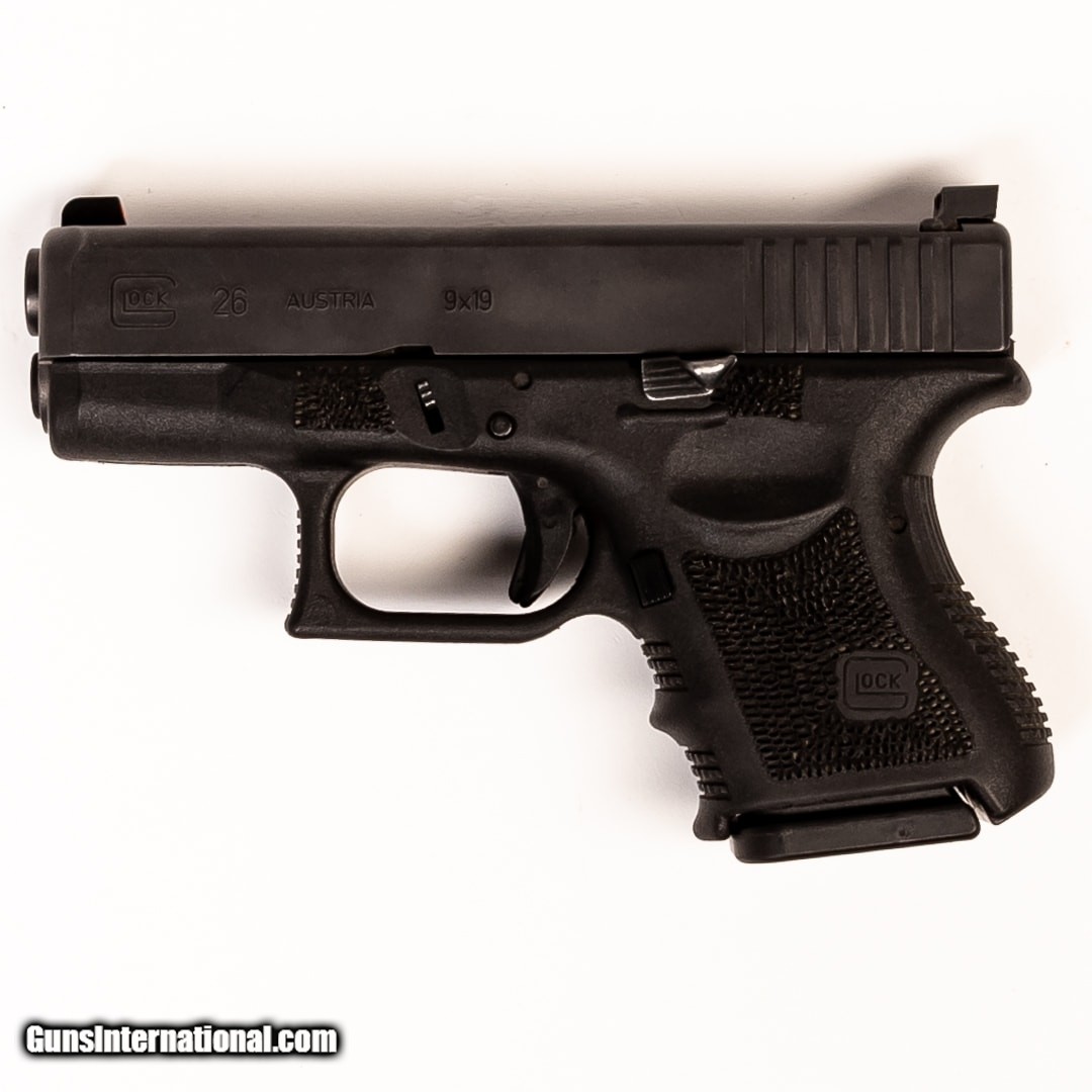 Description: Guns Listing ID: 545054 Known as the \"Baby Glock,\" the Glock G26 is a semi-automatic handgun chambered in 9mm. It‚‚s well-equipped for self-defense and makes a great concealed carry weapon. This US-made Gen 3 has professionally installed stippled Trijicon sights and an extended slide release. The original case and two 10-round magazines are included. SOLD Manufacturer: GLOCK Model: 26 Caliber Info: 9MM LUGER (9X19 PARA) Condition: Used - Certified Barrels: 34 BARREL Finish: BLACK |