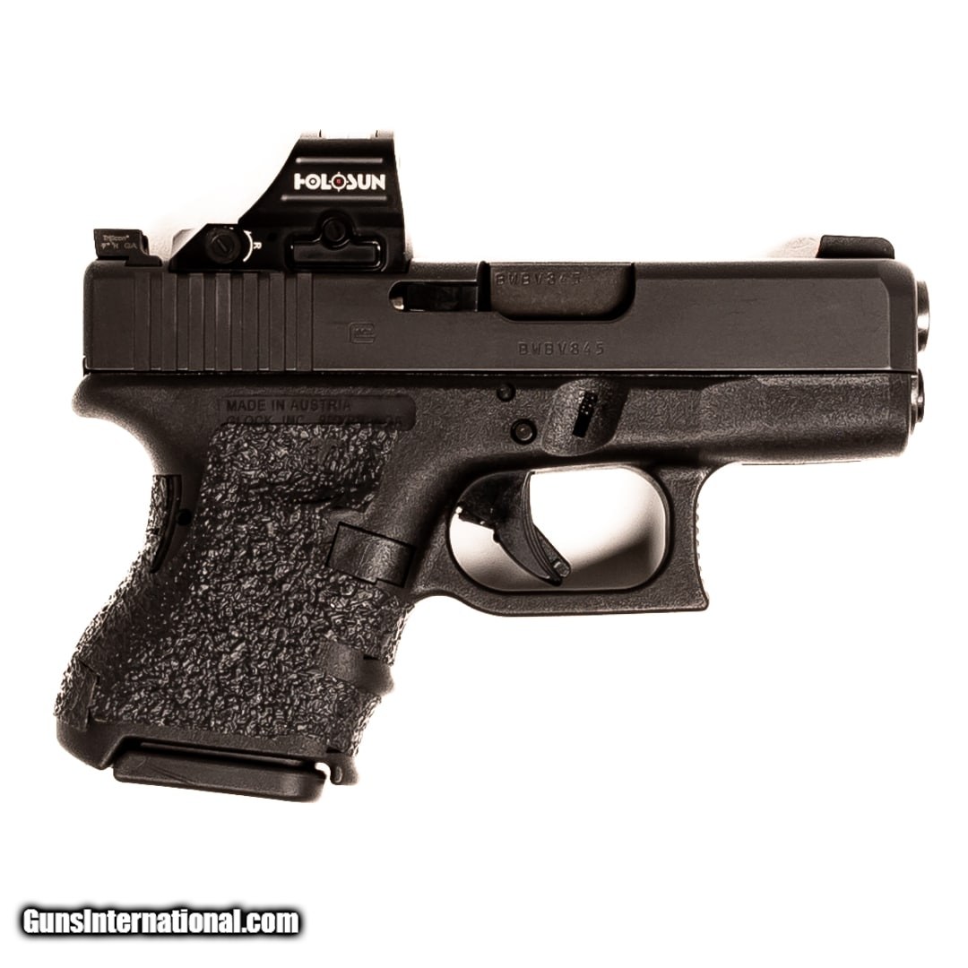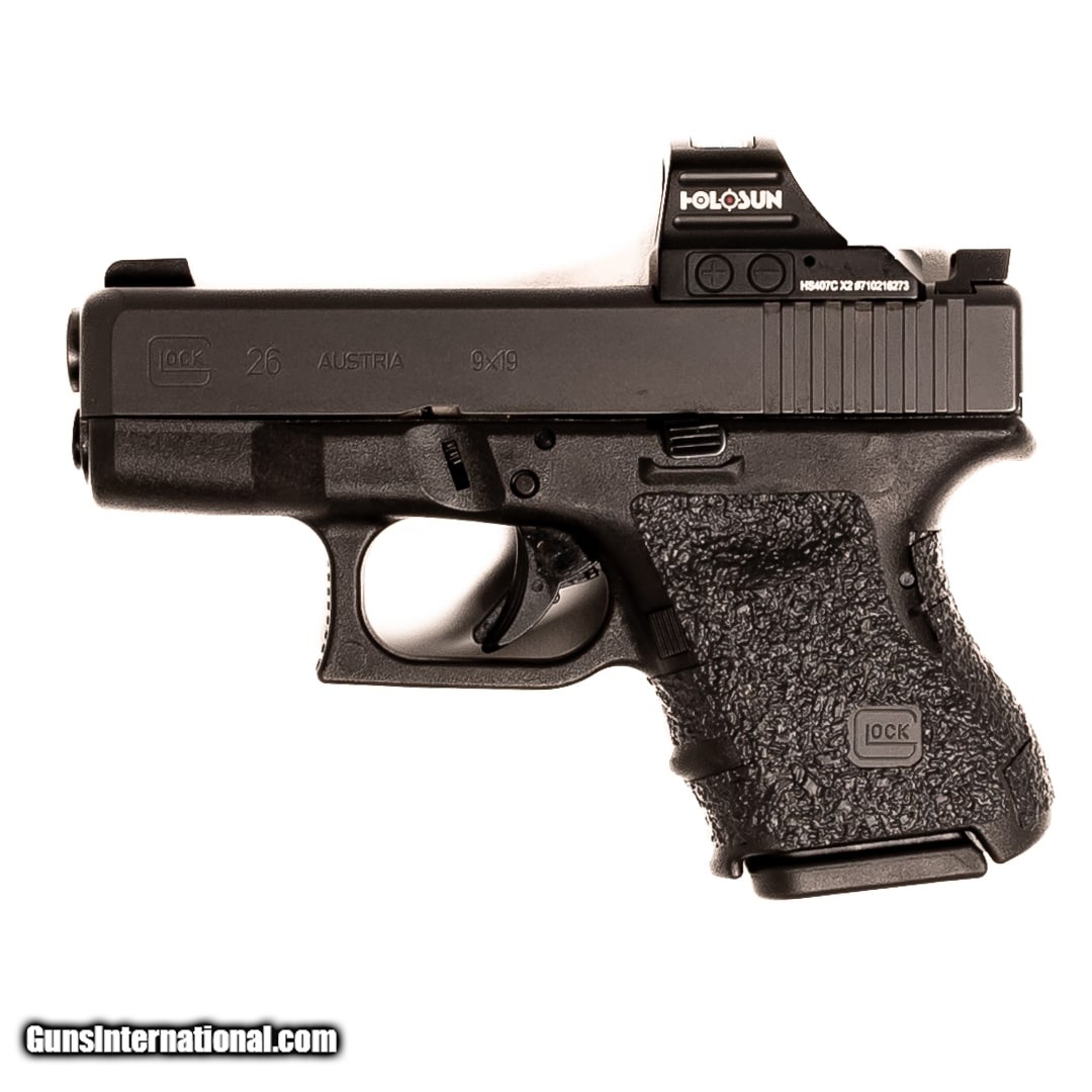 Description: Guns Listing ID: 755622 Also known as the \"Baby Glock,\" the Glock 26 is one of America‚‚s most popular concealed carry options. This sub-compact pistol is built on the company‚‚s signature lightweight polymer frame with rough texture technology for added durability. This Gen 4 model is equipped with a Holosun 407c and Trijicon night sights. Two 10-round magazines are included. Get the best bang for your buck when you get a Certified Used Firearm . When you see the Certified Used stamp on any of our firearms, you can be confident that you’re getting exactly what you want – a gun only in very good to excellent condition and held to the highest quality standard. All Certified Used Guns come with a ‘no questions asked’ return policy . PLUS, ALL CERTIFIED USED GUNS SHIP FRE SOLD Manufacturer: GLOCK Model: 26 Caliber Info: 9MM LUGER (9X19 PARA) Condition: Used - Certified Barrels: 3.4 BARREL Finish: BLACK |