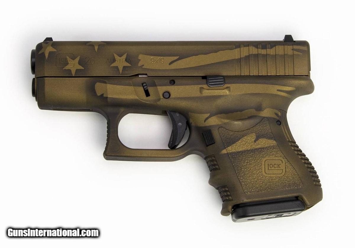 Description: Guns Listing ID: 372075 Similar in size and weight to the small-frame snub-nose revolvers it has replaced, the GLOCK G26 fires the popular 9 mm Luger cartridge with minimum recoil and more on-target accuracy at a fast rate of fire. Its an ideal backup for those who use the GLOCK 17 or GLOCK 19 for open carry, even more so since the larger 9mm magazines fit the G26 as well. SOLD Manufacturer: GLOCK Model: G26 Gen 3 Caliber Info: 9MM LUGER (9X19 PARA) Condition: new Barrels: 3.43" barrel Finish: BATTLE FLAG CERAKOTE |