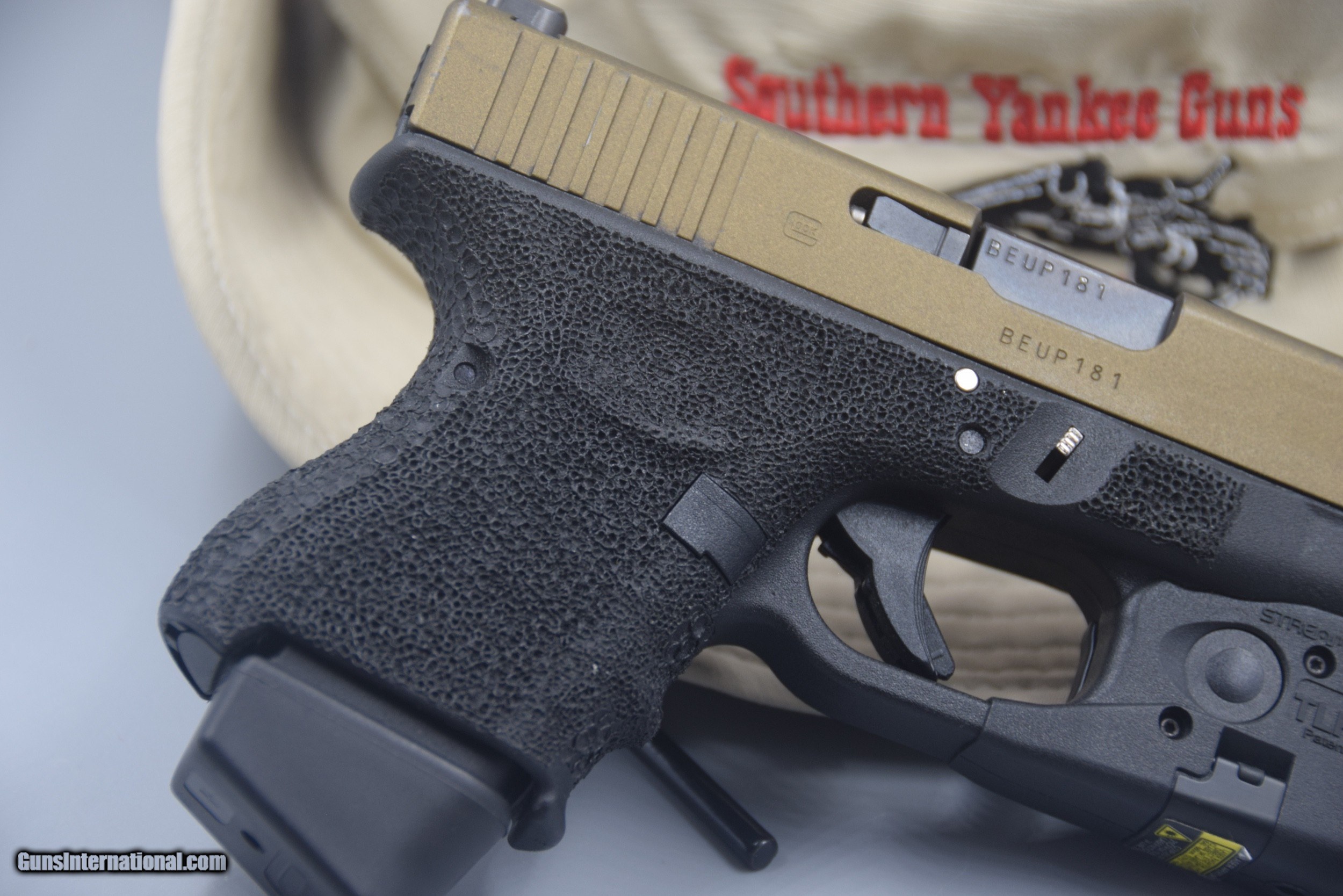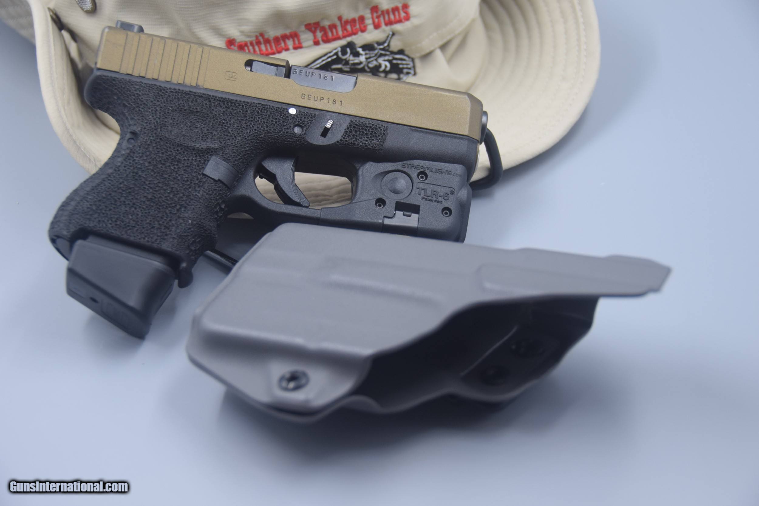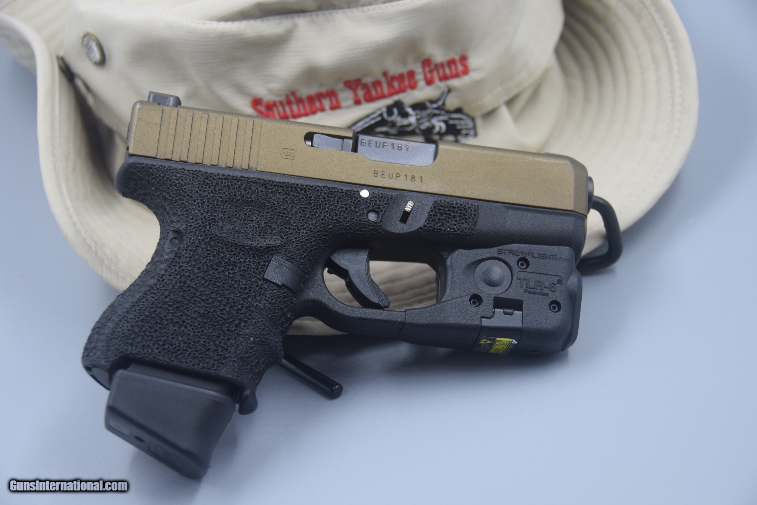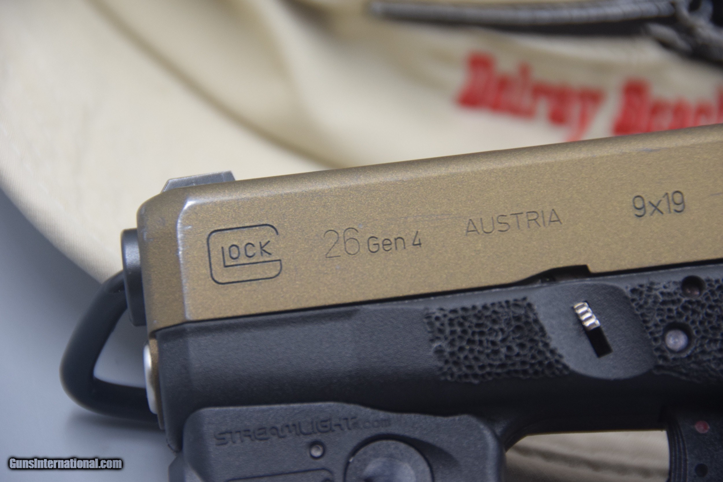 Description: Here's a GLOCK MODEL 26, FORTH GENERATION CUSTOMIZED 9 MM PISTOL WITH TWO MAGAZINES and the box. The frame has been stippled; night sights installed; it has an extended mag releaased, slide release, and takedown releases; a stainless steel guide rod; and has had the slide Cerakoted bronze (there is some carry/holster marks, but the gun has ony been minimly shot). A TLR-6 LIGHT/LASER is also installed, and a holster is also included. The package is being offered for ONLY $699.95 plus shipping, cash or credit card.... SOLD |