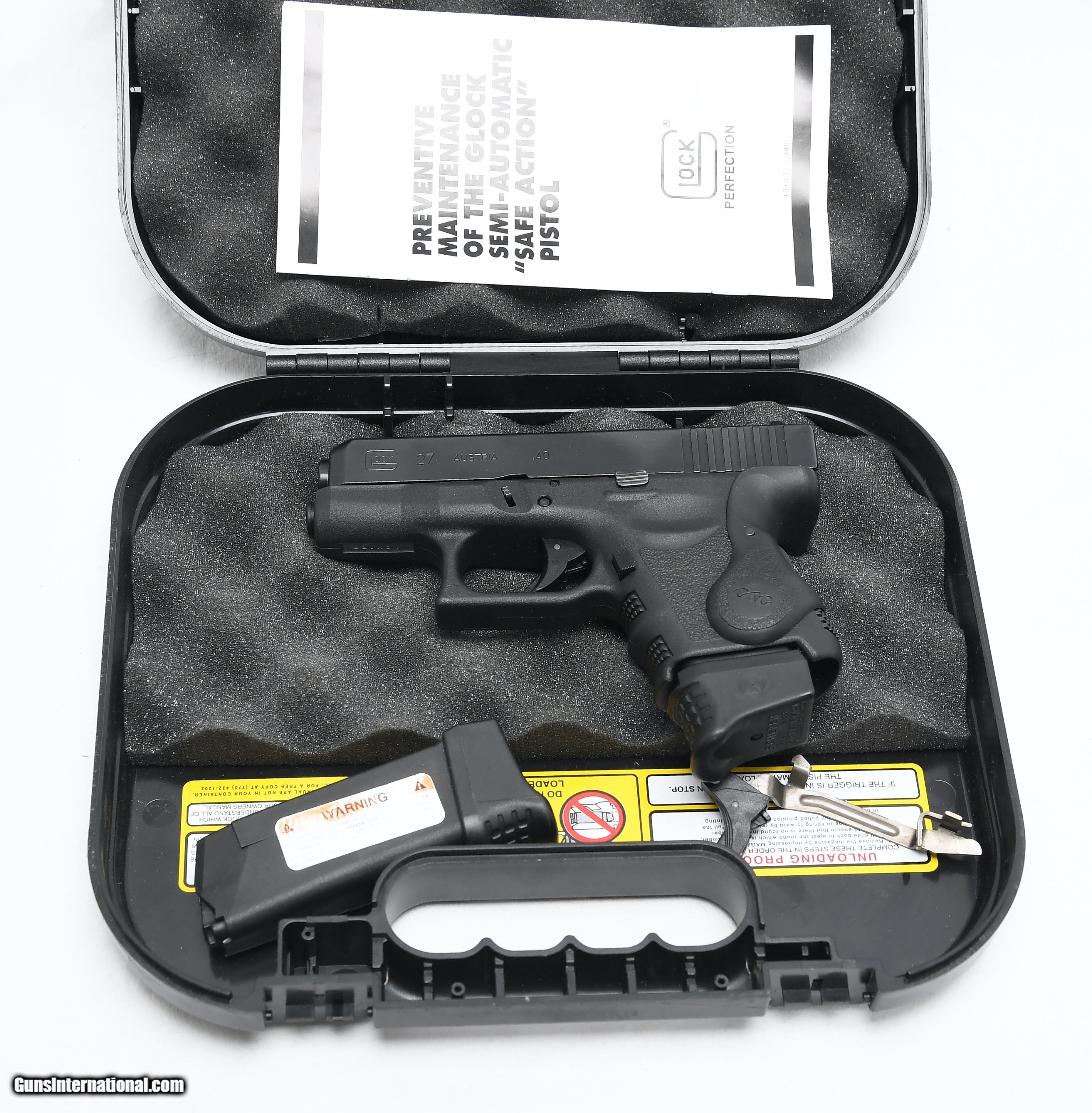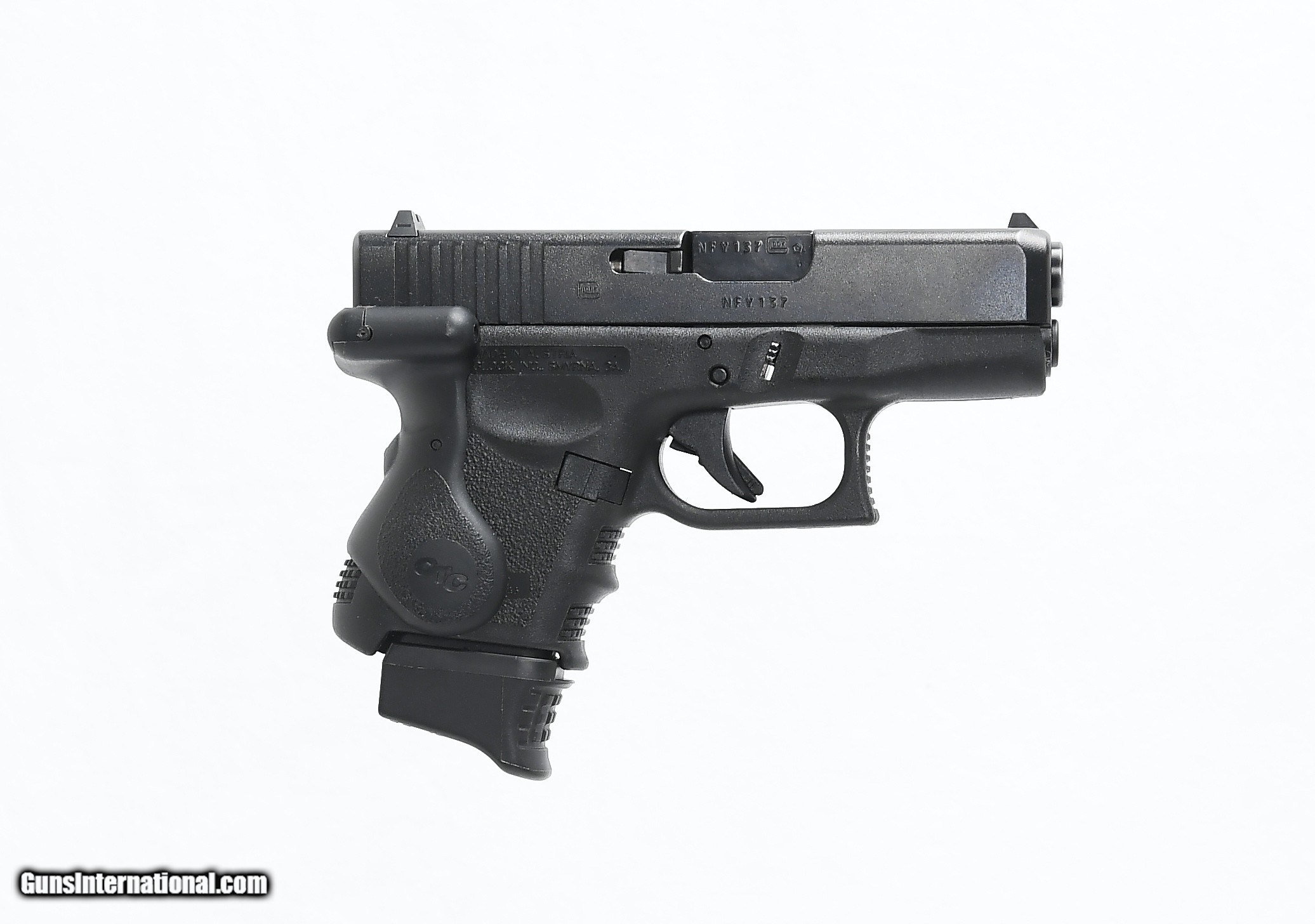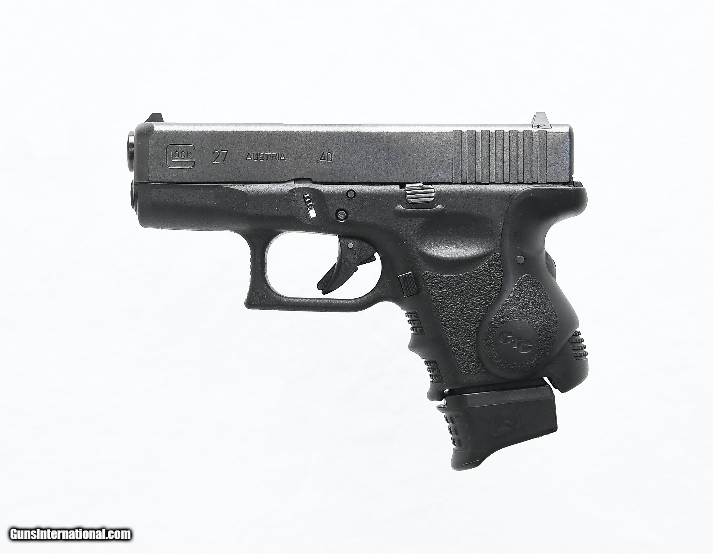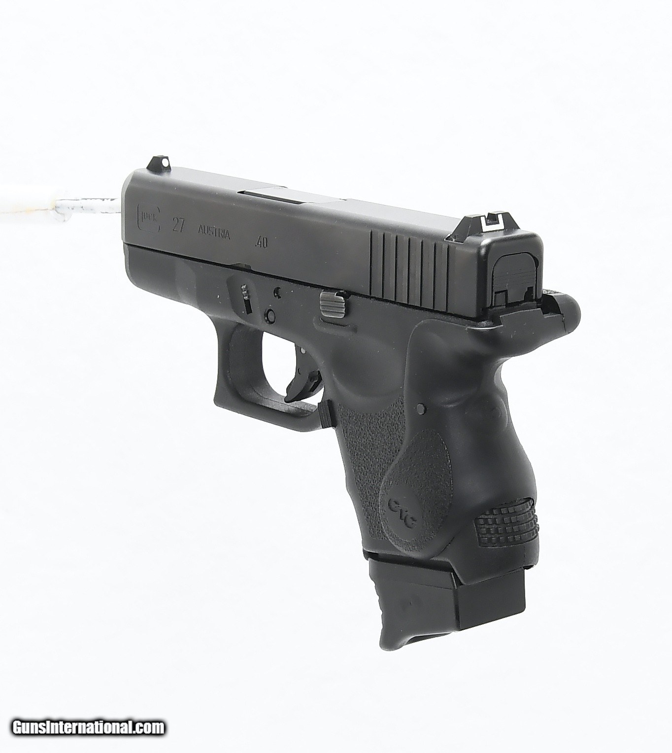 Description: SOLD Glock 27 sub-compact .40 S&W pistol. This one has had the trigger replaced with a lighter aftermarket unit (original in the box). Both magazines have Sherer extensions and Crimson Trace laser grip sight has been added. Test fired only. Box, all paperwork and paperwork included. SN: NFY137 SOLD |