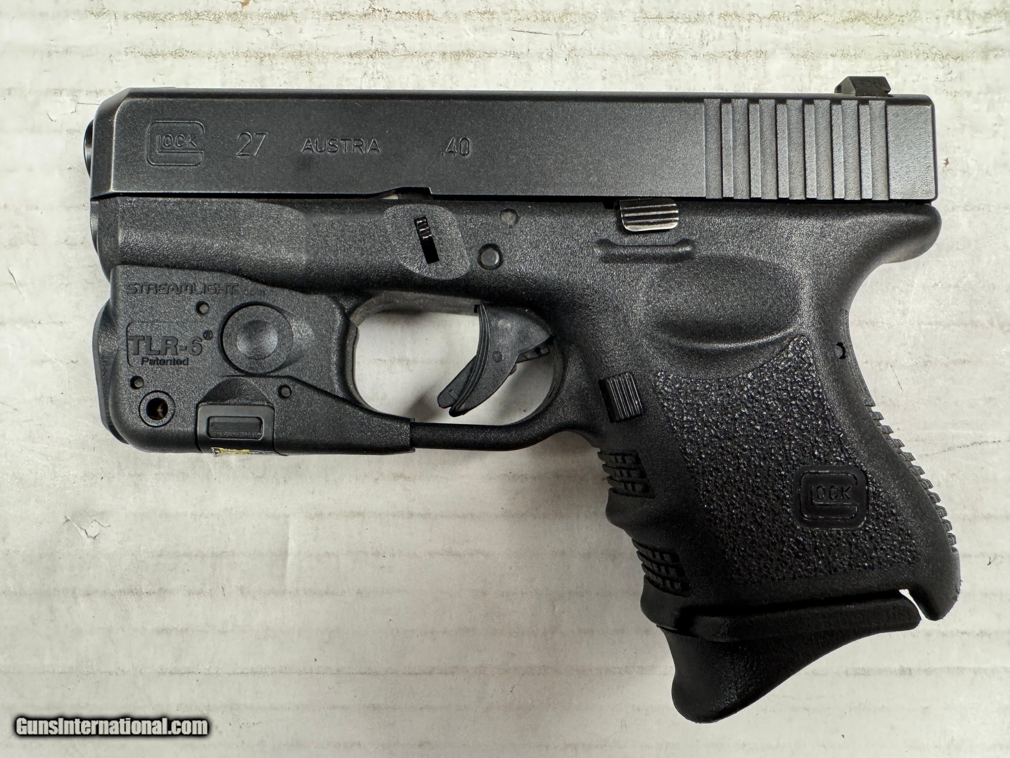 Description: Guns Listing ID: 489905 Glock, 27, GEN 3, Semi-automatic, Striker Fired, Sub-Compact, 40 S&W, 3.43\", Black, Interchangeable, 9Rd, 3 Mags, Fixed Sights, Polymer, Matte, Streamlight TLR-6 -Firearm is in great condition -Streamlight TLR-6 installed -3x Mags, hardcase included SOLD Manufacturer: GLOCK Model: G27 GEN 3 Condition: Used - Non-Certified Barrels: 3.43 Gauge Info: .40 S&W Finish: black |