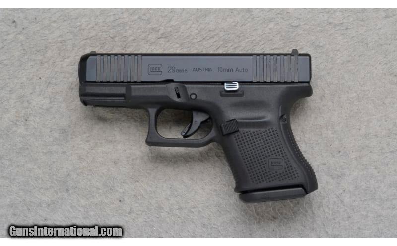 Description: This Glock Model 29 Gen 5 is a right hand semi-auto pistol in 10mm Auto Cal. It has a 3.75 inch barrel with a front and rear serrated slide. A blade front sight and notch rear sight, both with white highlights. The grip is a textured black polymer. It has a lower accessory rail. 10mm Auto SOLD Chambers: 10 round magazine. Metal Condition: Excellent. Bore Condition: Excellent. Barrels: 3.75 inch barrel with a front and rear serrated slide. Weight: 24 oz. Sights: Blade front. Notch rear. White highlights. Item Location: Richfield, WI |