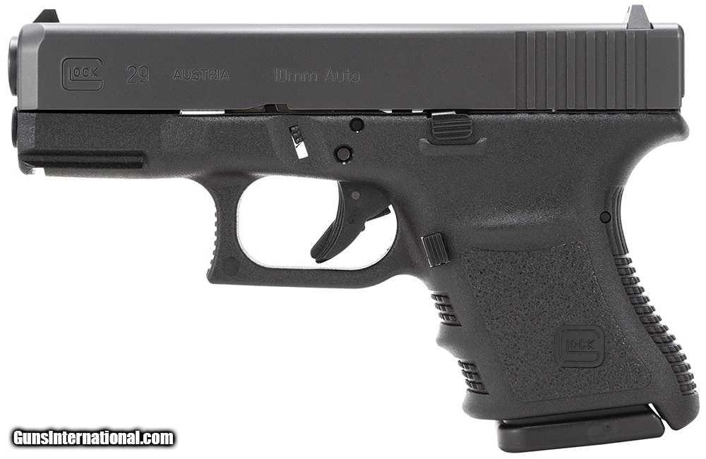Description: Guns Listing ID: 50372 This Glock 29SF (Short Frame) Gen 3 is a sub-compact, semi-automatic handgun chambered in 10mm. It delivers high performance and versatility with reduced dimensions and is well-suited for concealed carry or as a hunting sidearm. A modular backstrap system means the user can easily customize this pistol to fit his or her hand size, while the textured grip and finger grooves ensure a comfortable hold and secure grasp. The grip ergonomics of the 29SF Gen 3 make it an ideal choice for those with smaller hands. SOLD Manufacturer: GLOCK Model: G29SF Caliber Info: 10MM Condition: new Barrels: 3.8 BARREL |