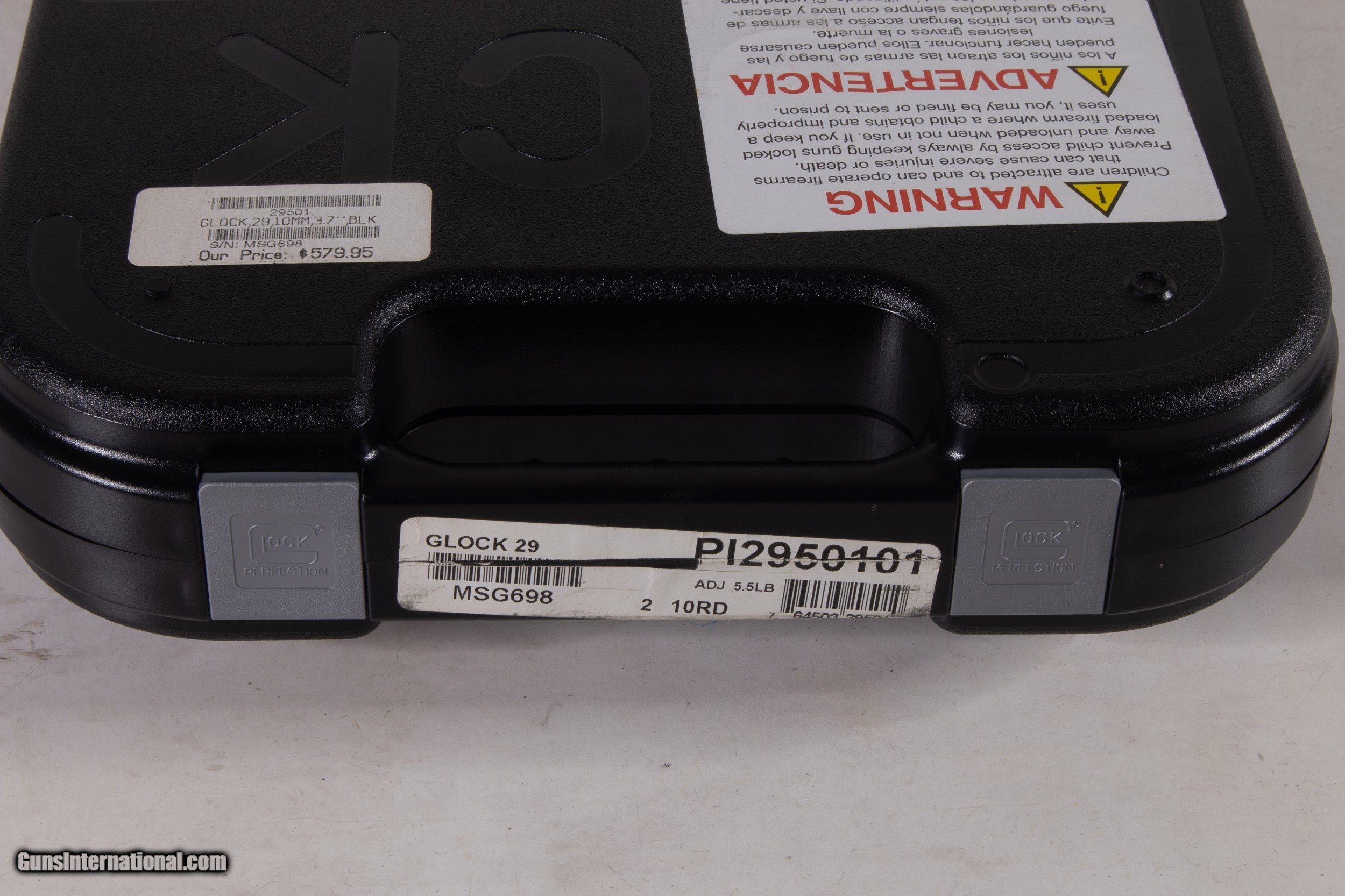 Description: VERY GOOD CONDITION. INCLUDES CASE, EXTRA MAG, PAPERWORK, AND LOCK. PLEASE ADD $25 FOR SHIPPING. SOLD Handgun Caliber: 10mm Auto Manufacturer: GLOCK Model: 29 Condition: EXCELLENT Metal Condition: EXCELLENT Wood Condition: EXCELLENT Bore Condition: EXCELLENT Action: SEMI |