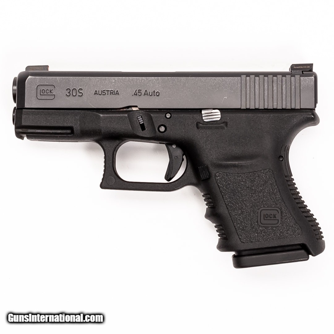 Description: Guns Listing ID: 343308 Compact and powerful, this Glock 30S SF is an excellent choice for concealed carry or home-defense. Ideal for close-range personal protection, the G30S is an affordable and reliable pistol that's genuinely hard to beat. This pistol features Ameriglo night sights, two 10-round magazines, one 9-round magazine, and the original case with manual. SOLD Manufacturer: GLOCK Model: G30S SF GEN3 Caliber Info: .45 ACP Condition: Used - Certified Barrels: 3.8 BARREL Finish: BLACK |