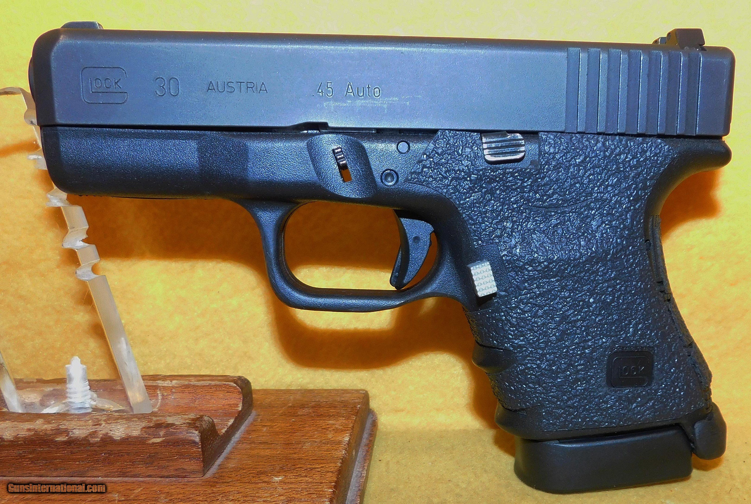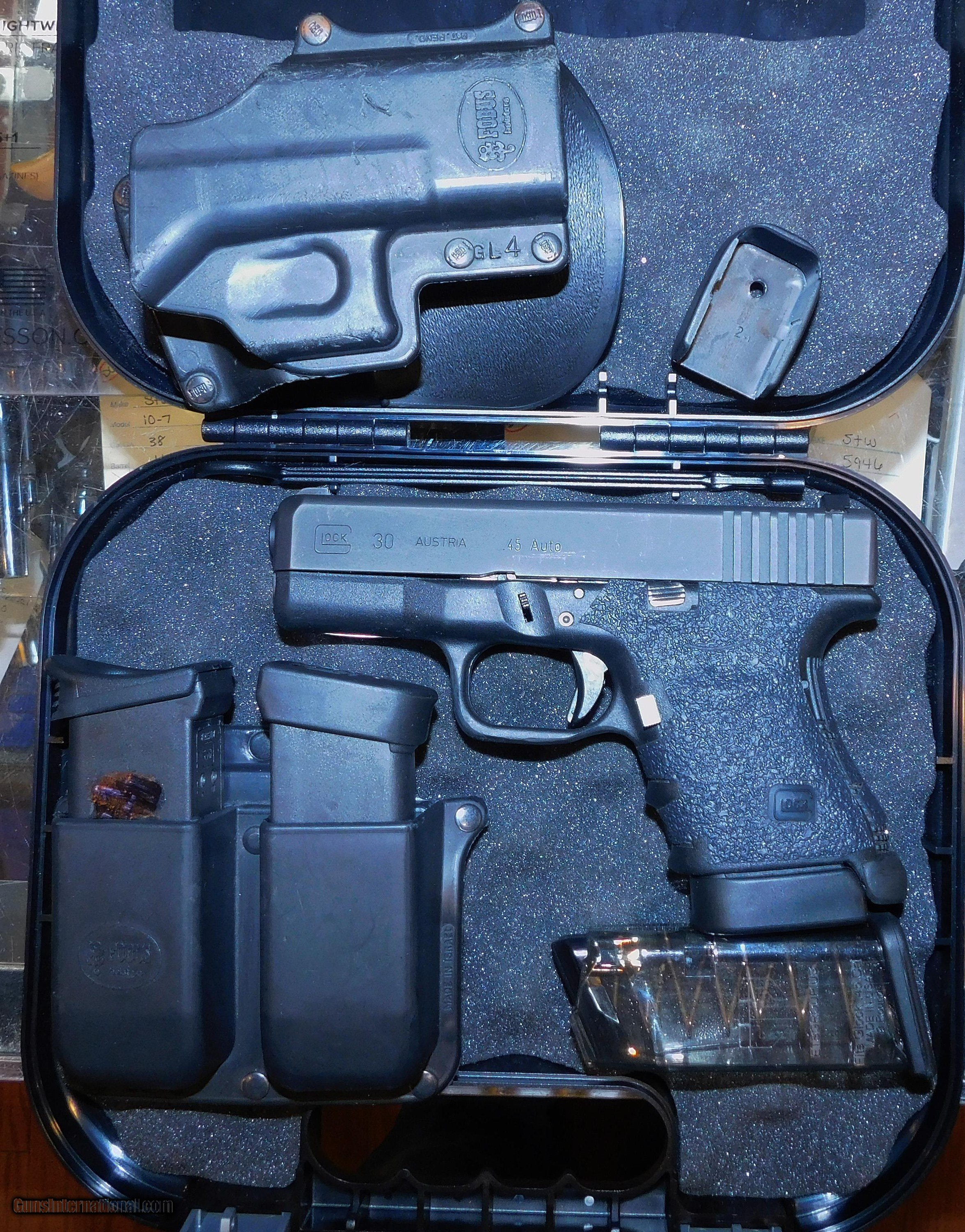 Description: GLOCK (MASS OK) 30 IN .45 CAL., WITH 3 .25" BARREL. COLOR BLACK. CONDITION 96%. SERIAL NUMBER CYT180US. GLOCK MODEL 30 IN .45 ACP CALIBER, MIRROR BORE, SOLID GUARD ROD AND SPRING, MAG RELEASE EXTENSION, COMES WITH HARED CASE, HOLSTER, THREE FACTORY MAGAZINES, MASS. OK, 96% OVERALL CONDITION, OUR STOCK # D6342 SOLD |
