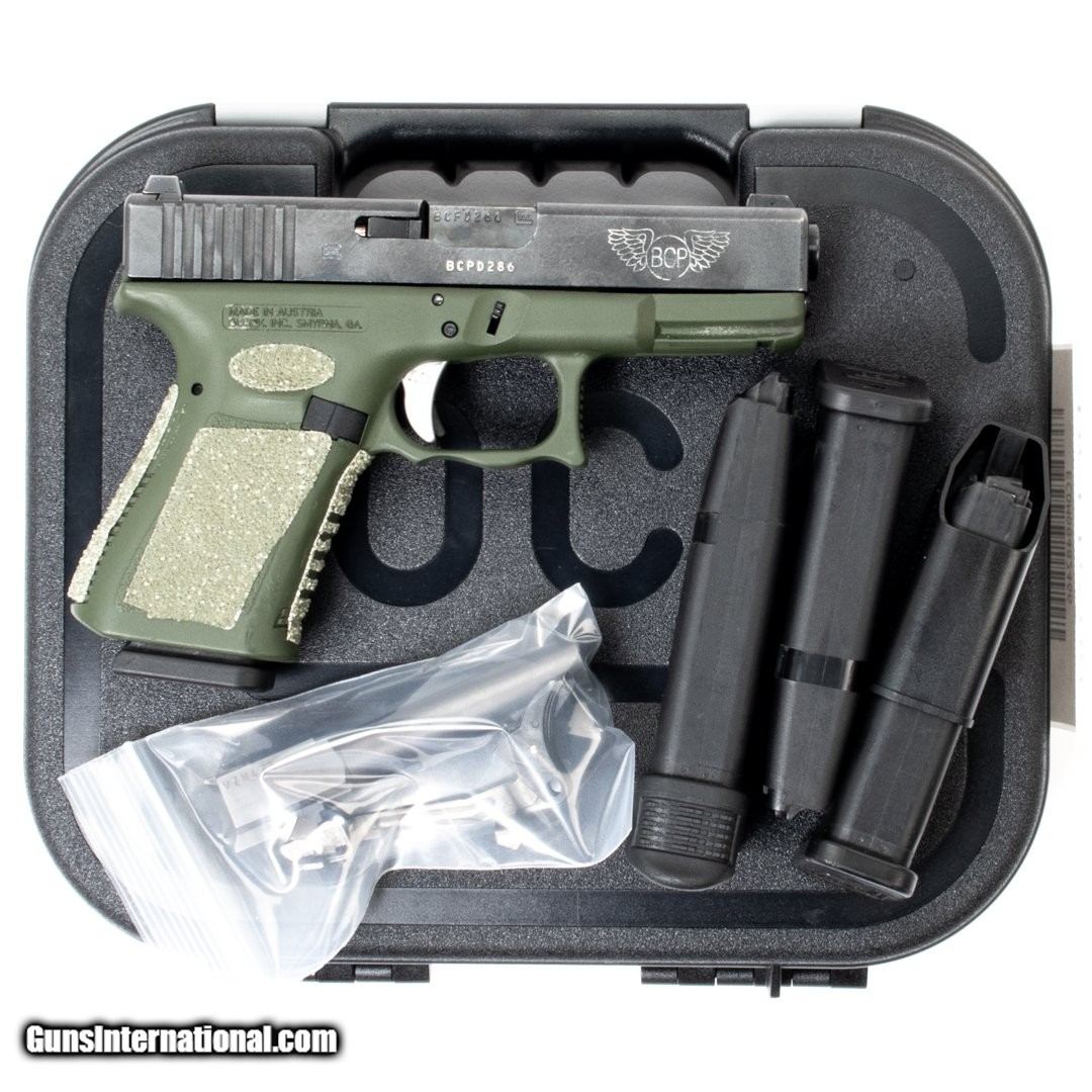 Description: Guns Listing ID: 579638 This Glock G32 Gen 3 features grip tape, a Cerakoted frame, a double undercut trigger guard, aftermarket internals, GLock night sights, and a Glock Store pyramid trigger. The black slide has \"BCP\" and wings etched on the right side of the slide, and the grip frame finger nubs have been cut off. Purchase includes a Glock case, the owner‚s manual, three 13-round .357 Sig magazines, the original trigger, a Glock .40 S&W 4\" conversion barrel, and one 13-round .40 S&W magazine. Get the best bang for your buck when you get a Certified Used Firearm . When you see the Certified Used stamp on any of our firearms, you can be confident that you‚re getting exactly what you want – a gun only in very good to excellent condition and held to the highest quality standard. All Certified Used Guns come with a ‚no questions asked‚ return policy . SOLD Manufacturer: GLOCK Model: 32 Caliber Info: .357 SIG Condition: Used - Certified Barrels: 4.00" BARREL Action: SEMI AUTOMATIC Finish: BAZOOKA GREEN AND BL Weight: 1.4 |