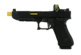 Glock 34 9mm caliber pistol. Custom Glock 34 with slide reduction cuts, Trijicon RMR, L2D threaded fluted barrel, grip stippling and upgraded trigger in excellent condition.