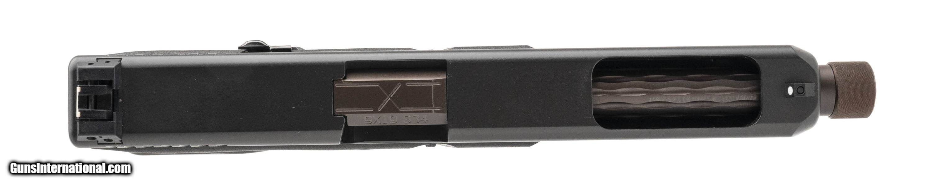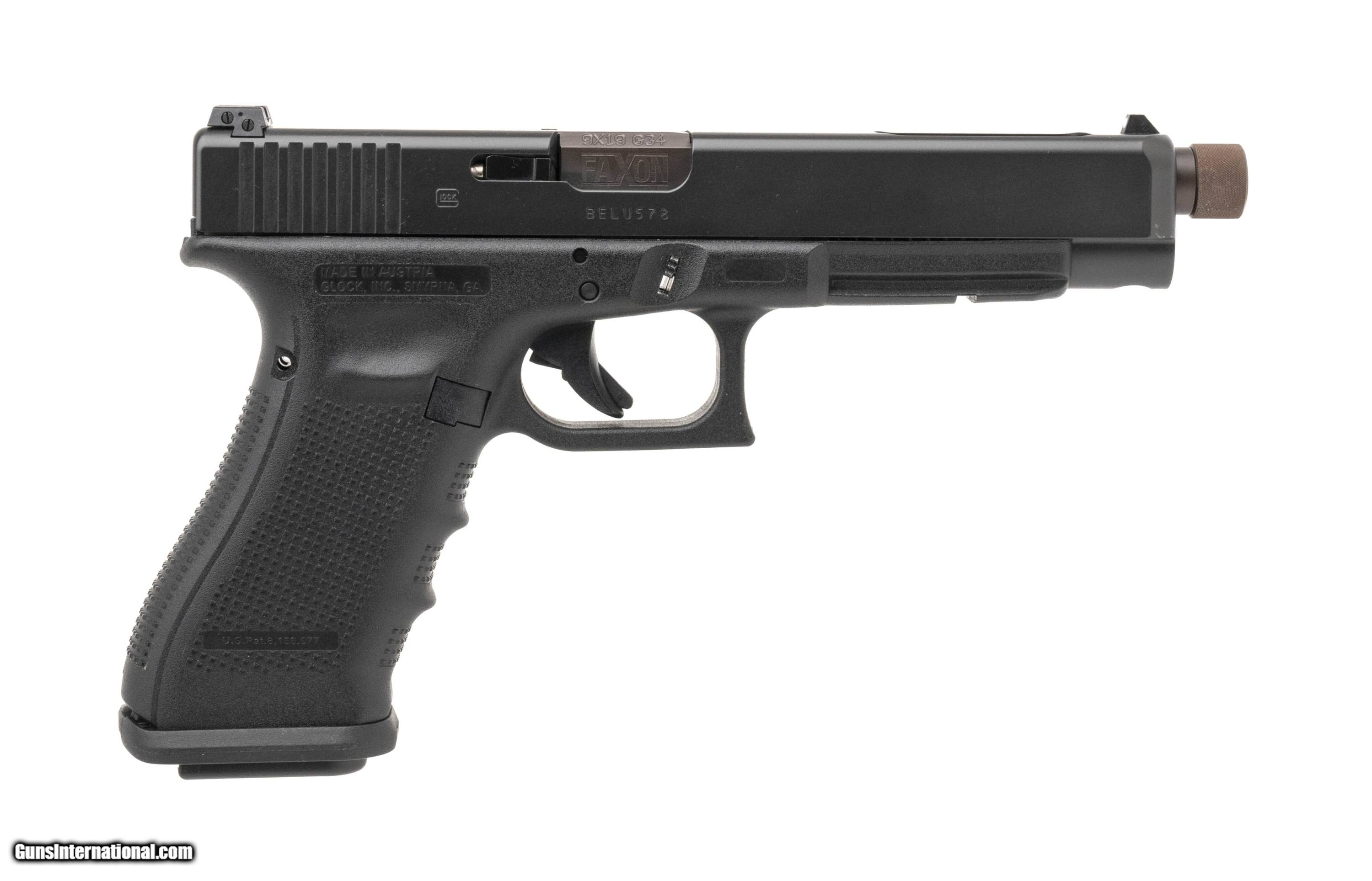 Description: "SN: BELU578. Modern production. Semi-automatic handgun chambered in 9mm with a 5.5"" barrel. Bore condition is excellent. Frame and slide condition are excellent. Come with a threaded barrel from Faxon. Has Glock adjustable u notch sights. Slide has top cut window standard from Glock. Comes with 3 Magazines. Austin Location SOLD |