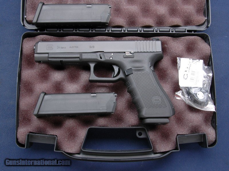 Description: Excellent condition overall, this Glock 34 is priced to sell. Clean and only very lightly used. Adjustable rear sight, comes with a hard case, safety lock and three 10 round magazines. Clean, bright, oiled barrel. $45 shipping to the lower 48, 3% surcharge for using a CC. If you pay with a personal check, you can expect us to hold the item for up to 10 days to ensure that the check clears. SOLD Handgun Caliber: 9x19mm Parabellum (9mm Luger, 9x19mm NATO) |