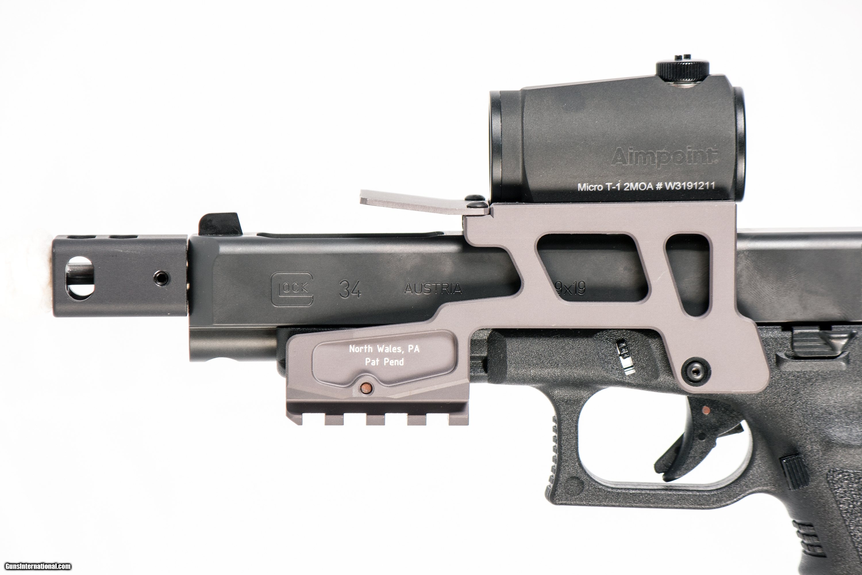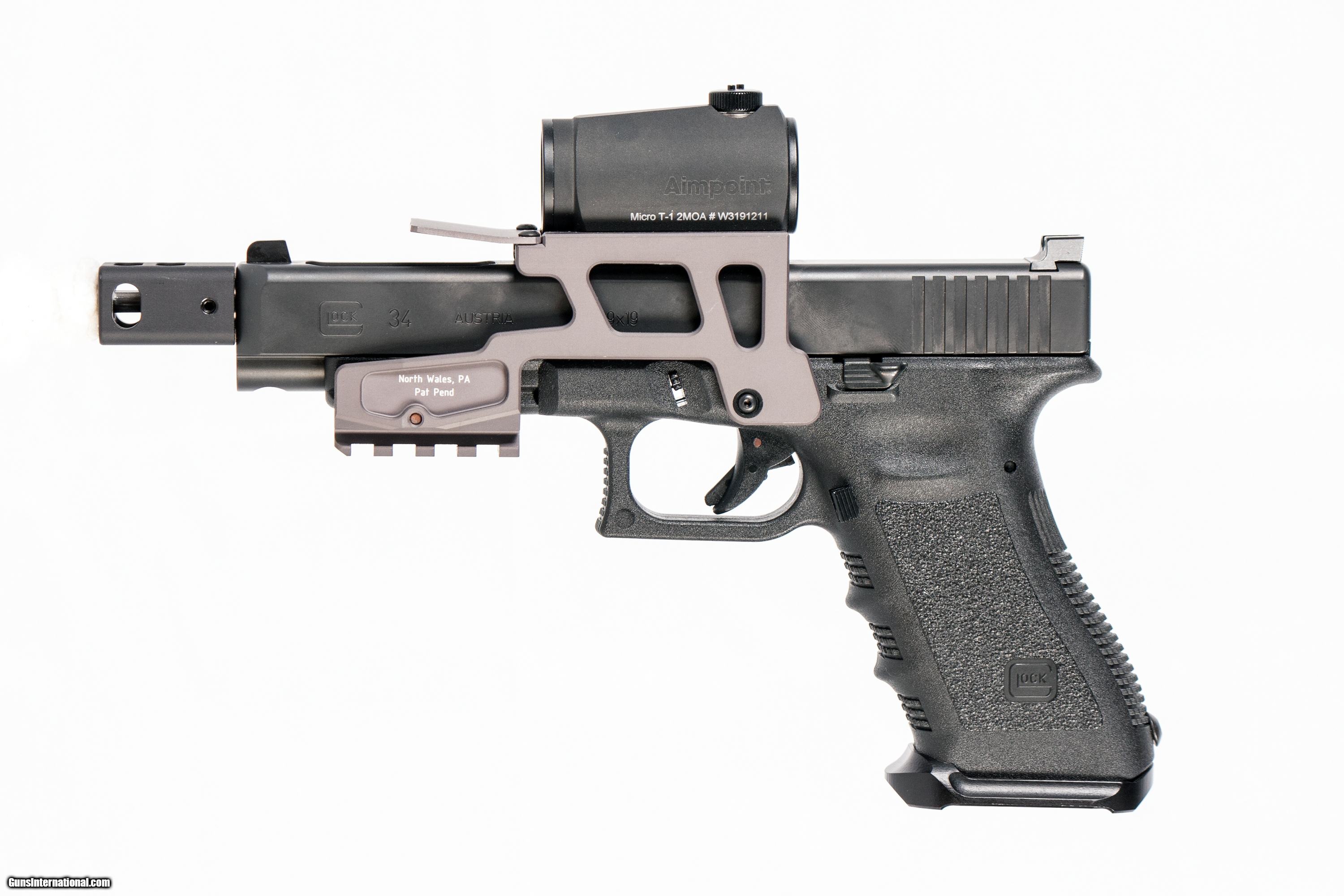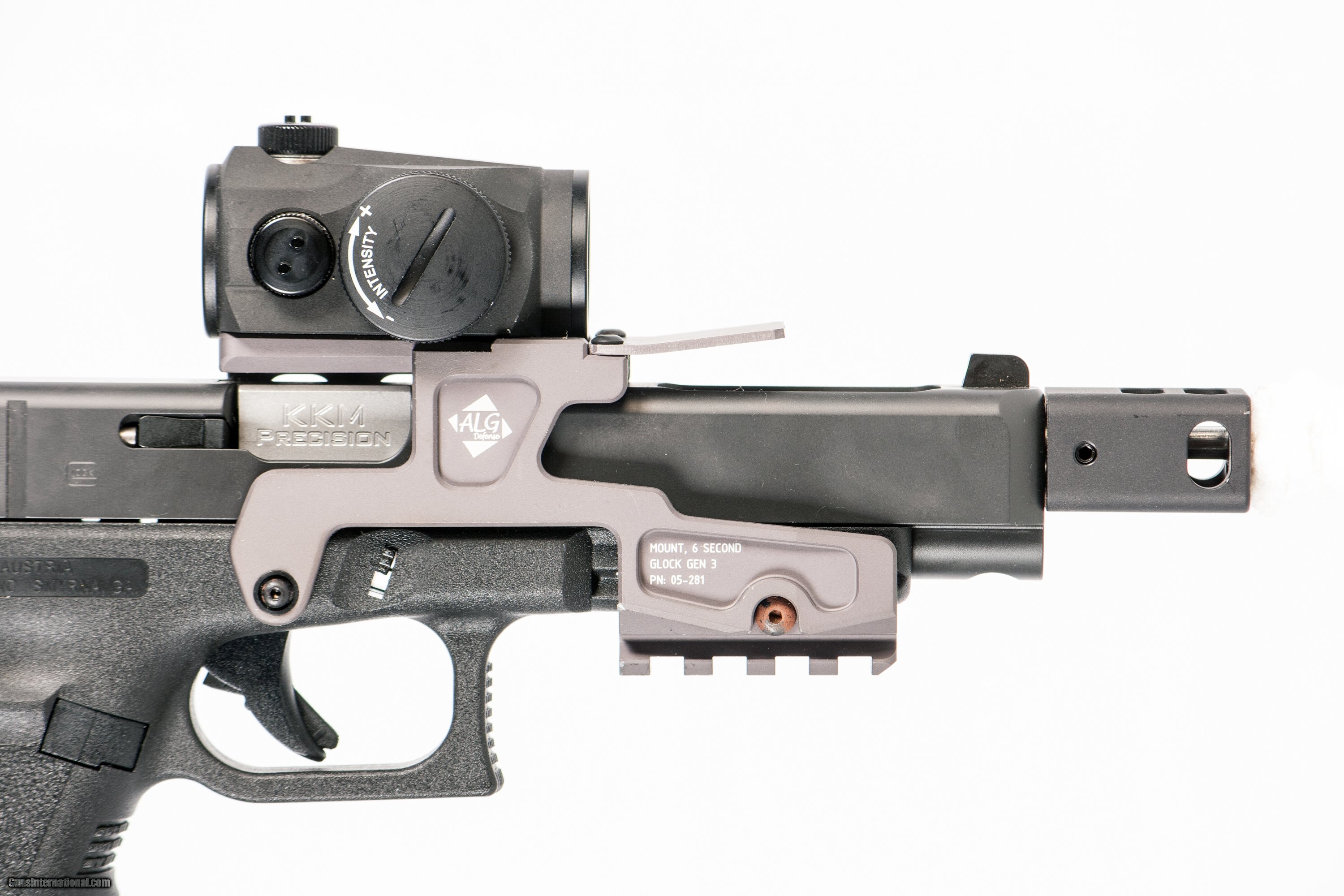 Glock 34 gen 3 chambered in 9mm with a 6 inch threaded barrel made by KKM precison with a bright and shiny bore with a compensator an ALG 6 second mount with an Aimpoint T-1 attached magwell funnel and Trijicon night sights. This firearm is in excellent condition and is covered by Dury's Lifetime Warranty.