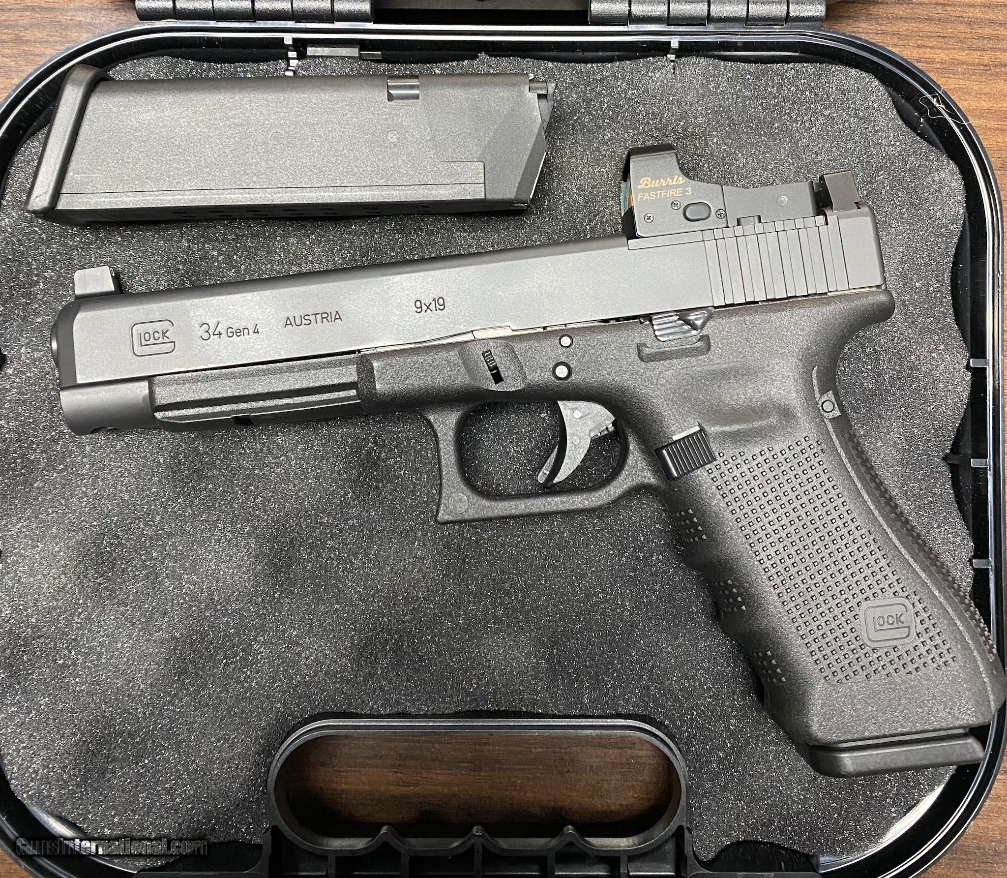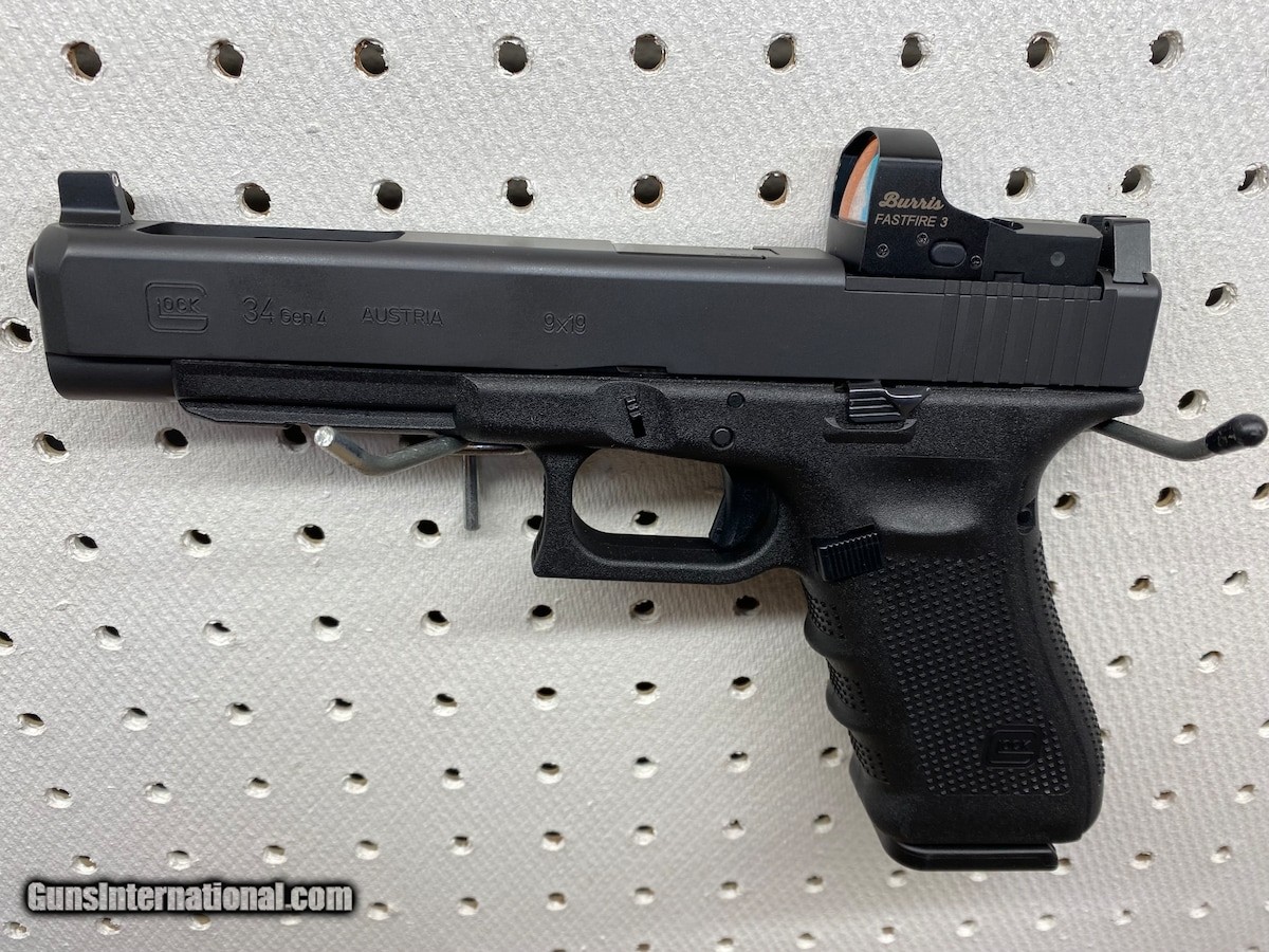 Description: Guns Listing ID: 484963 GLOCK 34 W/ BURRIS FAST FIRE 3 -RED DOT TRIJICON SUPPRESSOR HEIGHT SIGHTS 2 MAGS GLOCK BOX / NO DOCS Glock, 34 Gen4 Prac/Tac, Striker Fired, Semi-automatic, Polymer Frame Pistol, Long Slide, 9MM, 5.31\" Barrel, Matte Finish, Black, Fixed Sights, 17 Rounds, 2 Magazines SOLD Manufacturer: GLOCK Model: 34 G34 GEN 4 9MM MOS Caliber Info: 9MM Condition: Used - Non-Certified Barrels: 5.31 BARREL Finish: BLACK |