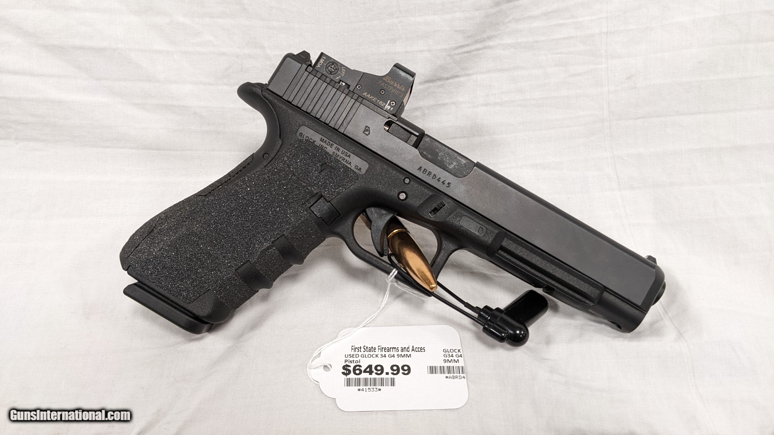 Description: This is a used item. While we do not test fire our used firearms, we perform an inspection and function check to determine the firearm is fully functional to the best of our ability. Please call with any questions. If you are interested in purchasing this item, please give us a call. Please have the "Seller #" and/or "Guns International #" ready along with the contact information for the FFL you'd like the item shipped to. For Sale from First State Firearms & Accessories AKA The Gun Shop in New Castle, DE. Shipping is $25.00. SOLD Handgun Caliber: 9x19mm Parabellum (9mm Luger, 9x19mm NATO) Manufacturer: GLOCK Model: G34 GEN. 4 Serial Number: ABRD45 Condition: USED, GOOD Action: SEMI-AUTO Extras: BOX, X1 SPARE MAGAZINE |