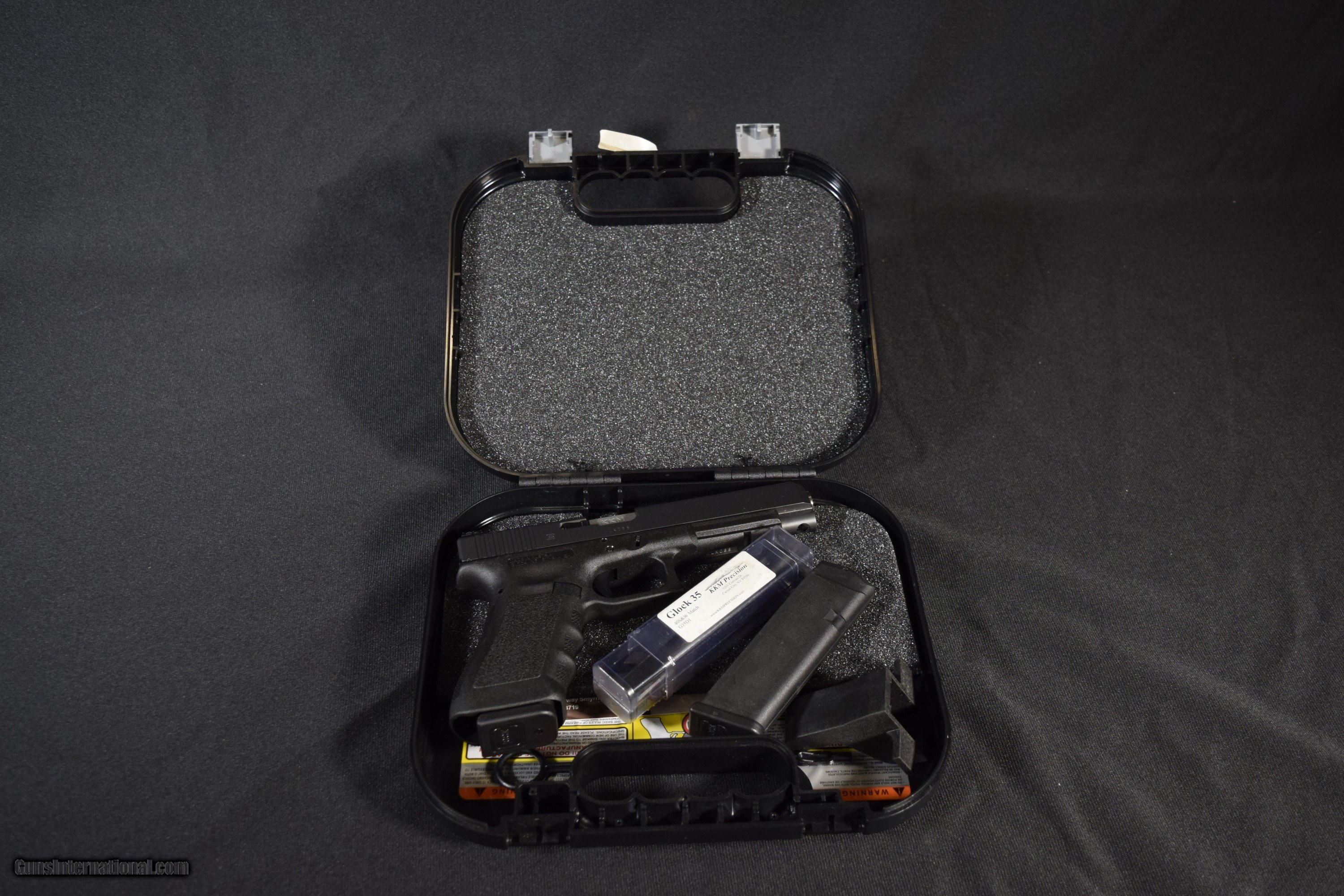 Description: The GLOCK 35 chambered in .40 Smith & Wesson is an evolution of the greatest service pistols on the planet. GLOCK made it even better by lengthening the slide and adding competition focused upgrades to create one of the most competitive striker fired pistols ever produced. Geared towards tactical and practical shooters, the GLOCK 35 is a standout among its peers thanks to a longer slide that allows shooters to acquire a more precise sight picture because of the extended sight radius making minute corrections much easier. The slide has been lightened to reduce split times between shots as well as make the pistol less nose heavy. The Gen 3 GLOCK 35 is another evolution of the timeless design with forward-thinking features that bring the pistol into the 21st century. New finger grooves and an updated texture on the grip ensure that you have a firm grasp even if your hands are sweaty or worse yet, bloody. GLOCK also added a standard light rail to the Gen 3 pistols to allow shooters to mount their choice of lights or lasers. This item comes with the original case and 2 magazines. Overall condition was great with little to no wear present form use.