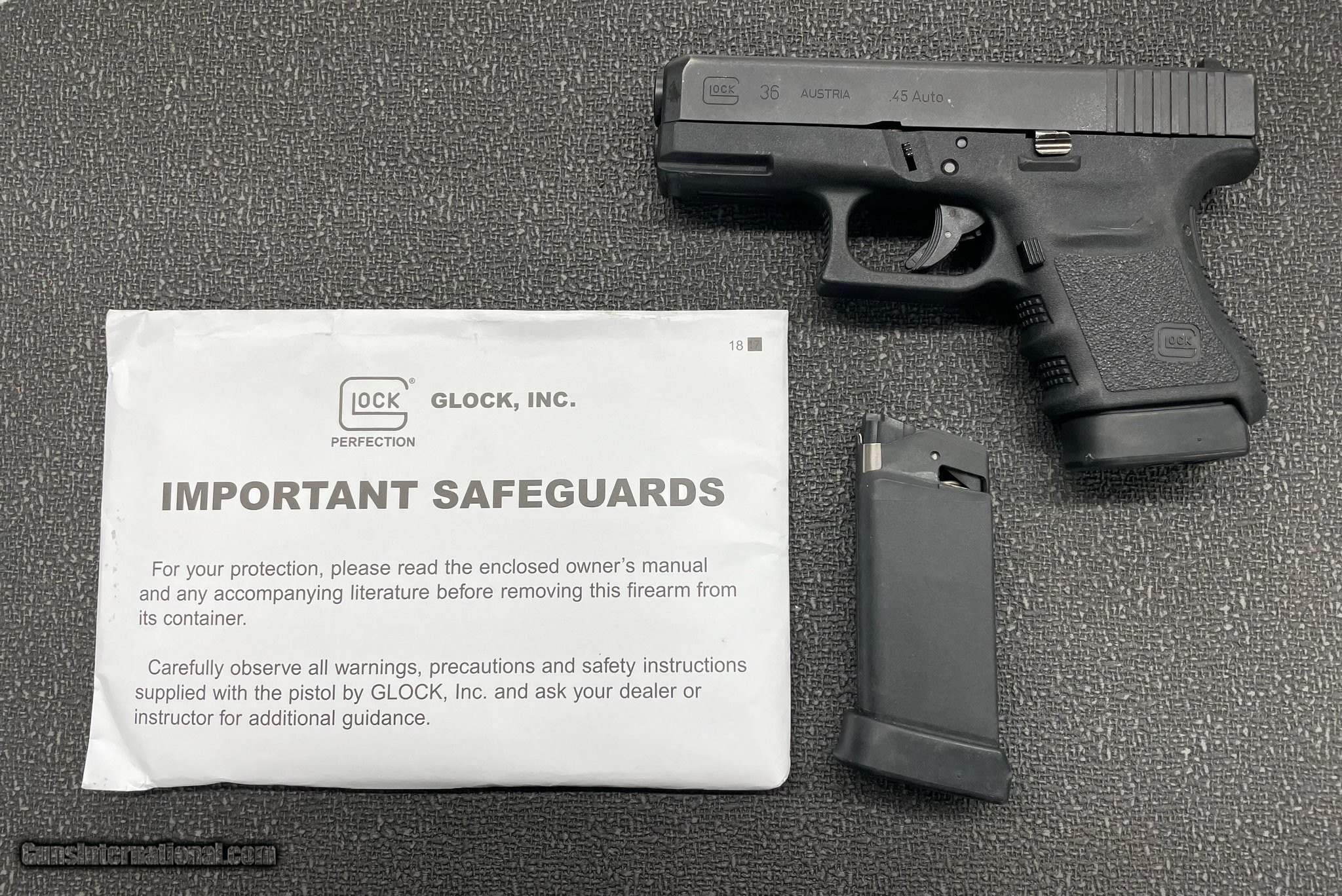 Description: Guns Listing ID: 489686 Used Glock 36 .45 it does have some scratches and scuffs on it. It also has some discoloration and wear on the slide. Includes hard case, extra mag and instruction manual. SOLD Manufacturer: GLOCK Model: 36 Caliber Info: .45 ACP Condition: Used - Non-Certified Barrels: 3.7" BARREL |