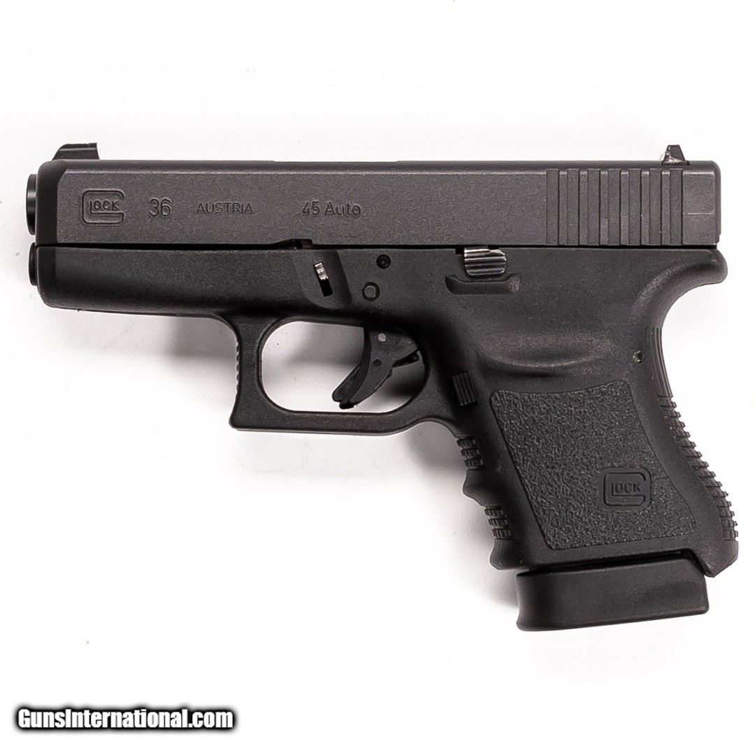 Description: Guns Listing ID: 287244 This Glock G36 is a semi-automatic handgun built on the company‚‚s signature polymer frame. Chambered in 45 ACP via a single-stack magazine, this pistol offers a slim frame and slide, alongside grip ergonomics of the next dimension. Lightweight, easy to handle, and easy to carry, the G36 is a popular option for self-defense. This pistol has Big Dot sights and is in very good condition. Purchase includes the original case, manual, and four 6-round magazines SOLD Manufacturer: GLOCK Model: 36 Caliber Info: .45 ACP Condition: Used - Certified Barrels: 3.78 BARREL Finish: BLACK |