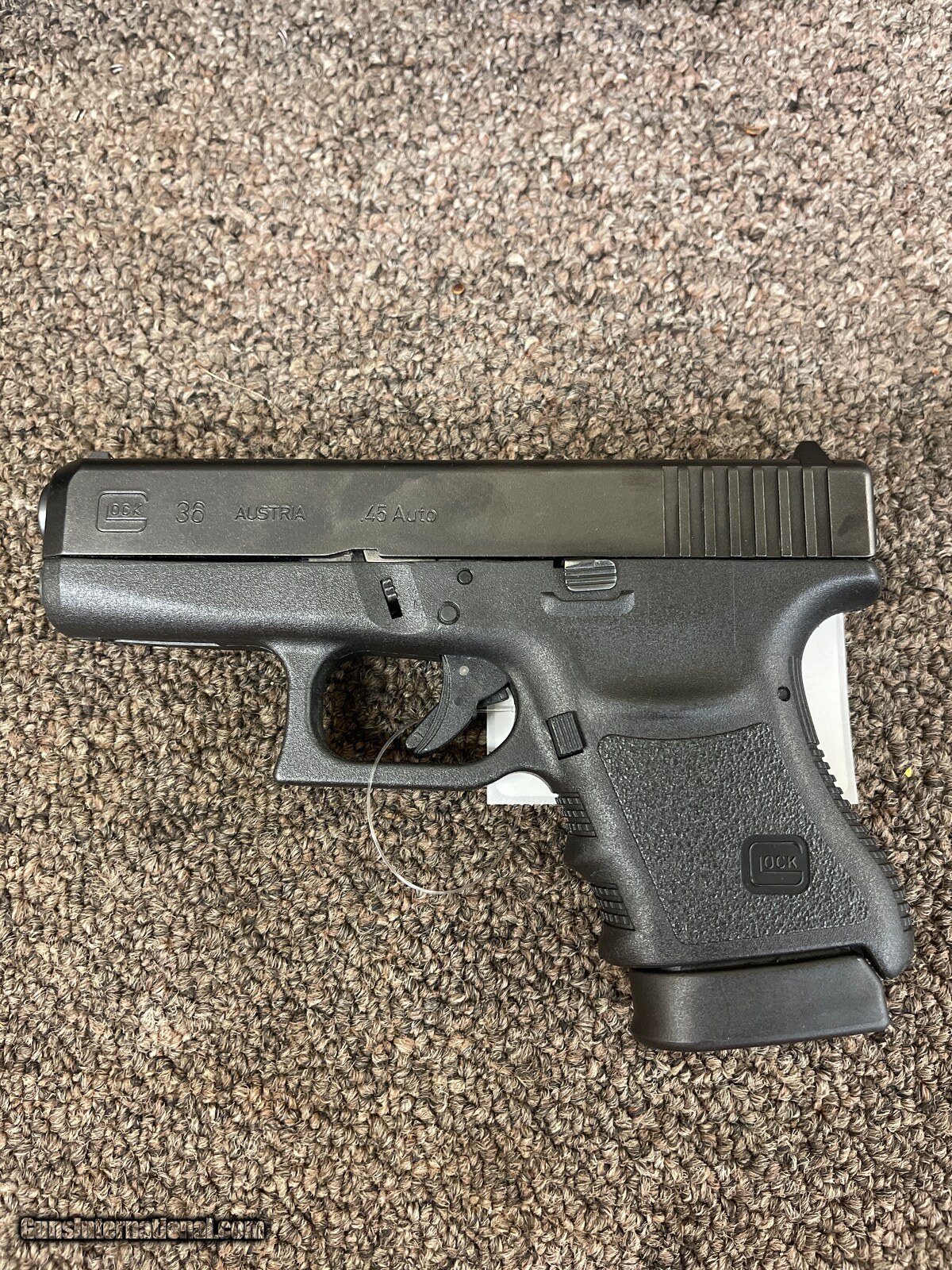Description: Guns Listing ID: 823050 Glock 36 with one magazine total SOLD Manufacturer: GLOCK Model: 36 Caliber Info: .45 ACP Condition: Used - Non-Certified Barrels: 3 BARREL Finish: BLACK |