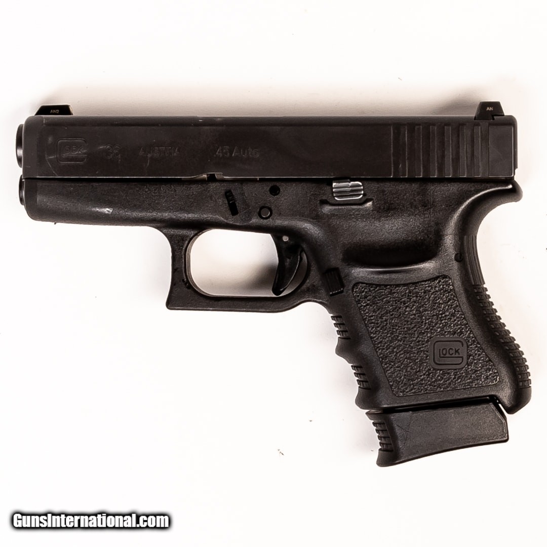 Description: Guns Listing ID: 562844 Powerful and compact, the Glock 36 makes an excellent option for concealed carry or a great backup pistol. This handgun features two 6-round magazines, night sights, and the orignal case with the manual. SOLD Manufacturer: GLOCK Model: G36 GEN 3 Caliber Info: .45 ACP Condition: Used - Certified Barrels: 3.78" BARREL |