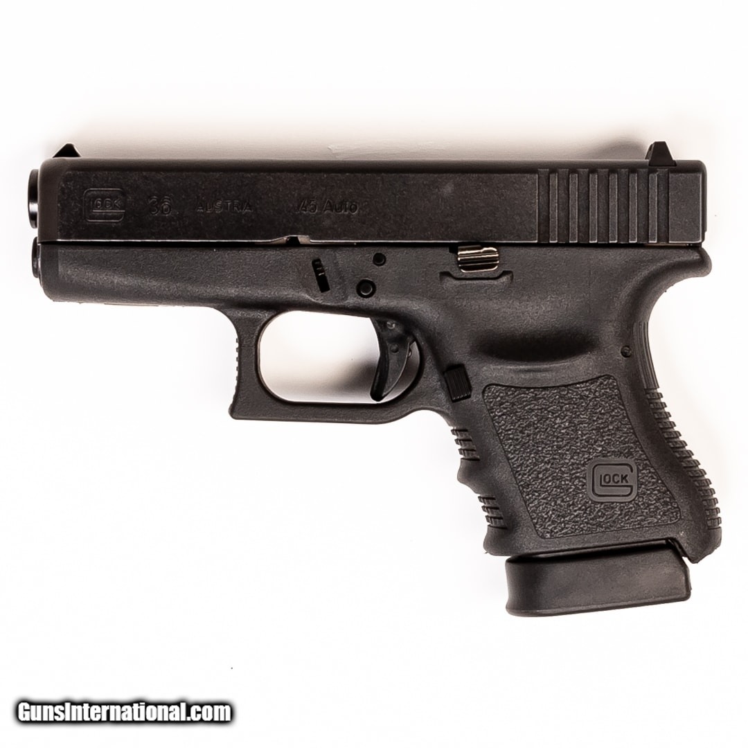 Description: Guns Listing ID: 508407 The Glock 36 is a compact .45acp that is easy to conceal and packs a punch. Slim and well built, this Glock lives up to the hype and will make a great EDC gun. 2-6 round magazines, the original case, and a manual are included. SOLD Manufacturer: GLOCK Model: G36 Caliber Info: .45 ACP Condition: Used - Certified Barrels: 3.8 BARREL Finish: BLACK |