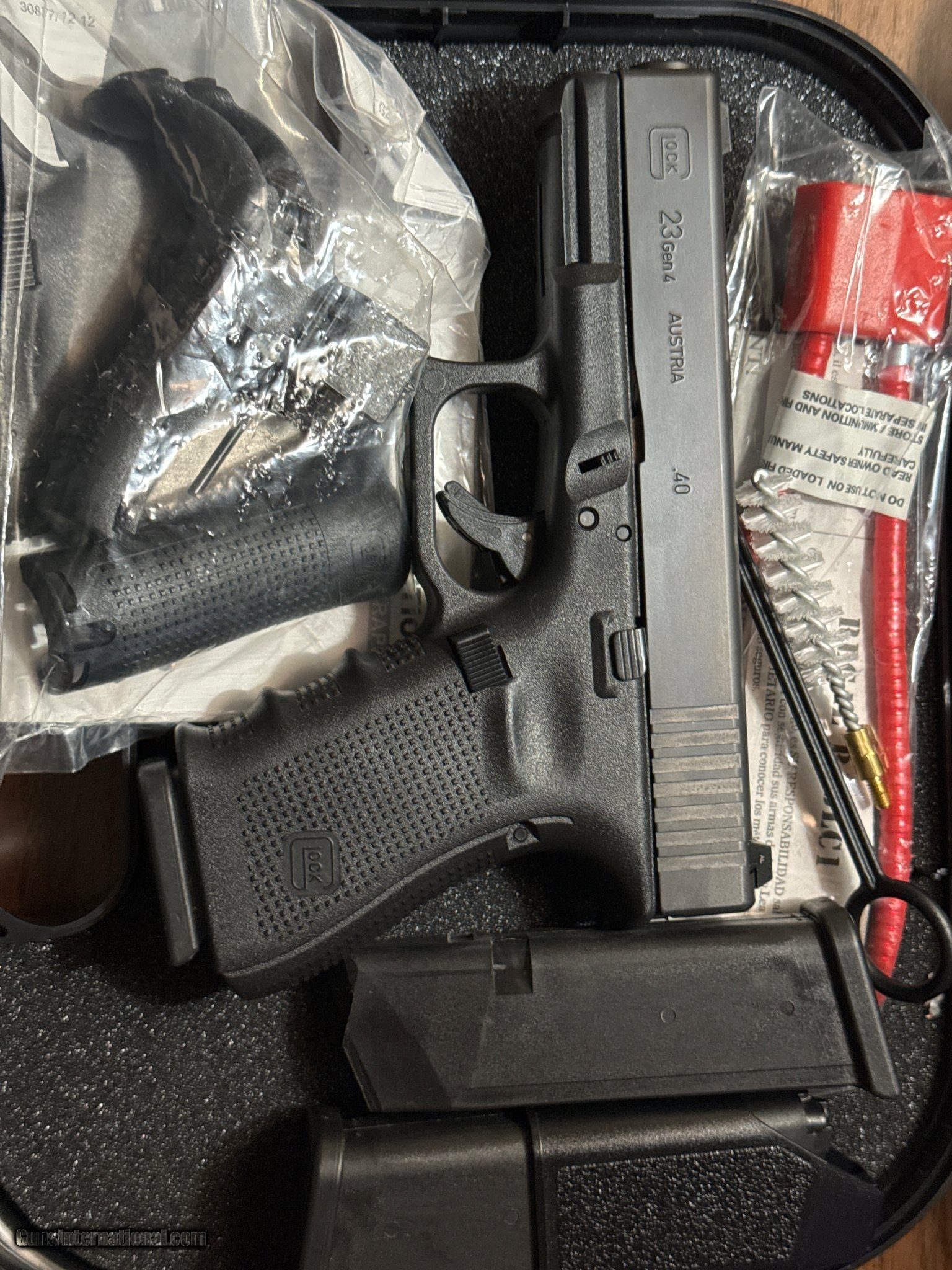 Description: Guns Listing ID: 1377196 Glock 23 GEN for law-enforcement trade-in. Gun is in great shape with minor external cosmetic where internal parts are like brand new gun looks like it’s maybe had one through. It comes with original Glock box 3 - 13 round magazines. And Glock night sights SOLD Manufacturer: GLOCK Model: .40 G23 GEN 4 Caliber Info: .40 S&W Condition: Used - Non-Certified Barrels: 4.01 BARREL Finish: BLACK |
