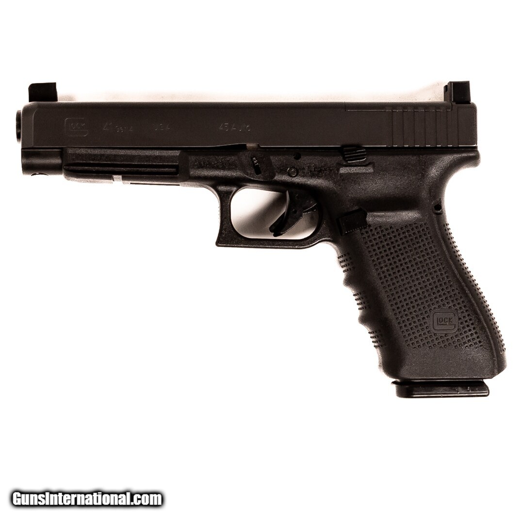 Description: Guns Listing ID: 733714 The GLOCK 41 Gen4 is a 45 Auto caliber pistol designed to maximize sight radius while achieving perfect weight distribution and balance. The longer barrel and slide help to reduce muzzle flip and felt recoil whereas the extended sight radius provides better accuracy. The Modular Back Strap system makes it possible to instantly customize its grip to accommodate any hand size. The reversible magazine catch makes it ideal for left and right-handed shooters. This Glock 41 Gen 4 MOS has been upgraded with TruGlo suppressor height night sights. 2-13 round magazines, the original case, manual, backstraps, and a loader are included. Get the best bang for your buck when you get a Certified Used Firearm . When you see the Certified Used stamp on any of our firearms, you can be confident that you’re getting exactly what you want – a gun only in very good to excellent condition and held to the highest quality standard. All Certified Used Guns come with a ‘no questions asked’ return policy . PLUS, ALL CERTIFIED USED GUNS SHIP FREE! SOLD Manufacturer: GLOCK Model: 41 GEN4 Caliber Info: .45 ACP Condition: Used - Certified Barrels: 5.3 BARREL Finish: BLACK |