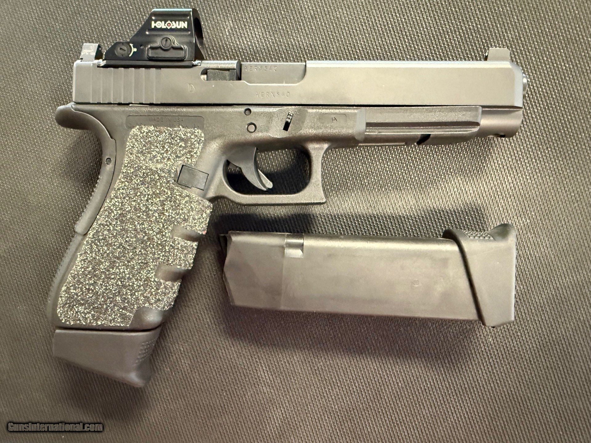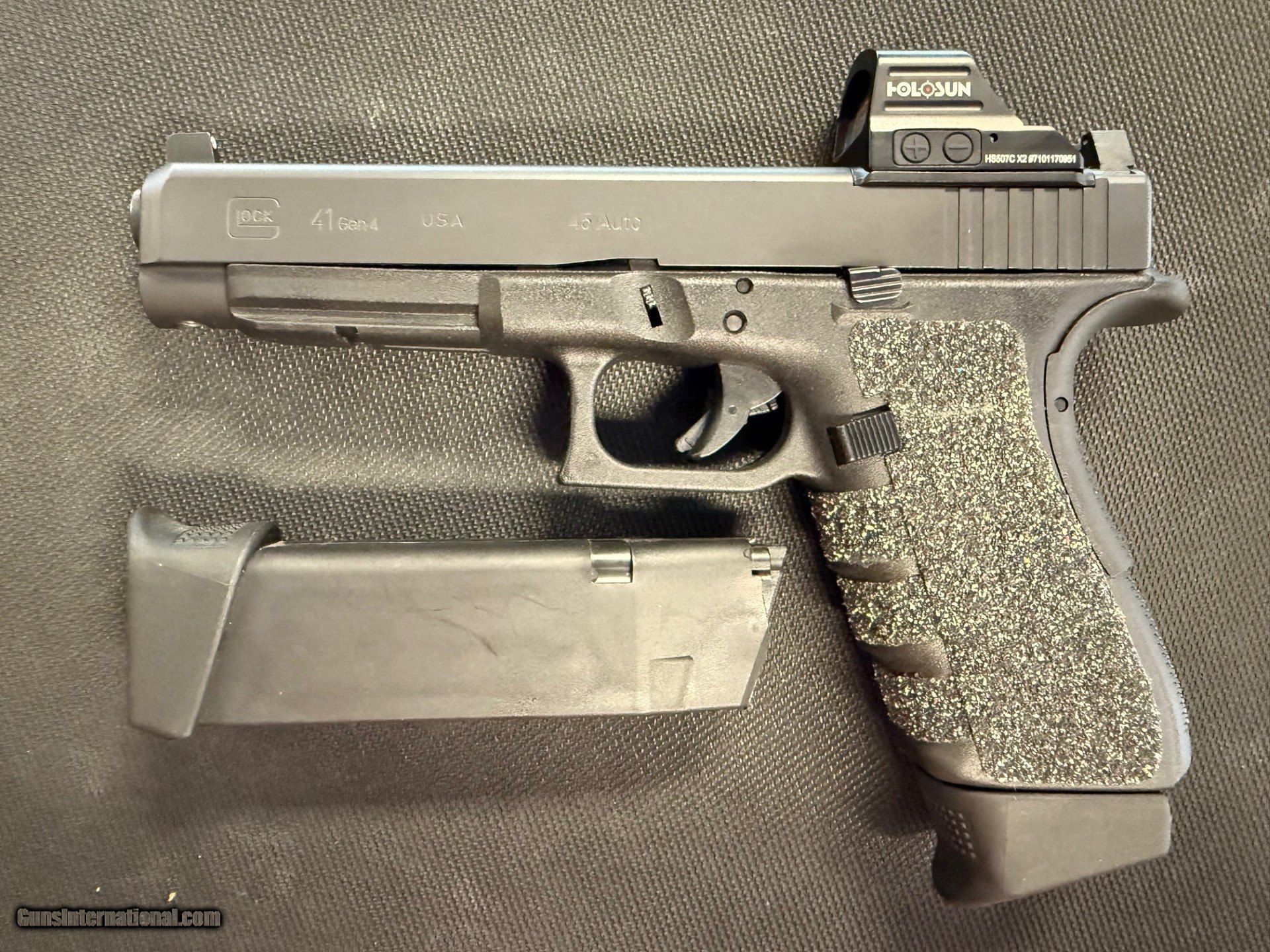 Description: Guns Listing ID: 533366 PRE-OWNED GLOCK G41 GEN4 MOS 13RD 45ACP BLACK WITH HOLOSUN 507C, FORWARD CONTROL DESIGNS OPTIC MOUNTING PLATE, AND TRIJICON SUPPRESSOR HEIGHT NIGHT SIGHTS. CONDITION: EXCELLENT, THIS PISTOL IS MECHANICALLY FLAWLESSS AND THE FINISH IS VERY GOOD. THE OPTIC IS PROPERLY MOUNTED AND ZERO‚‚D. THE PISTOL WILL SHIP WITH WHAT YOU SEE PHOTOGRAPHED. IT DOES NOT SHIP WITH THE ORIGINAL BOX, PLATES, BACKSTRAPS, OR MANUAL. SOLD Manufacturer: GLOCK Model: G41 Caliber Info: .45 ACP Condition: Used - Non-Certified Barrels: 5.3 BARREL Action: STRIKER FIRED |