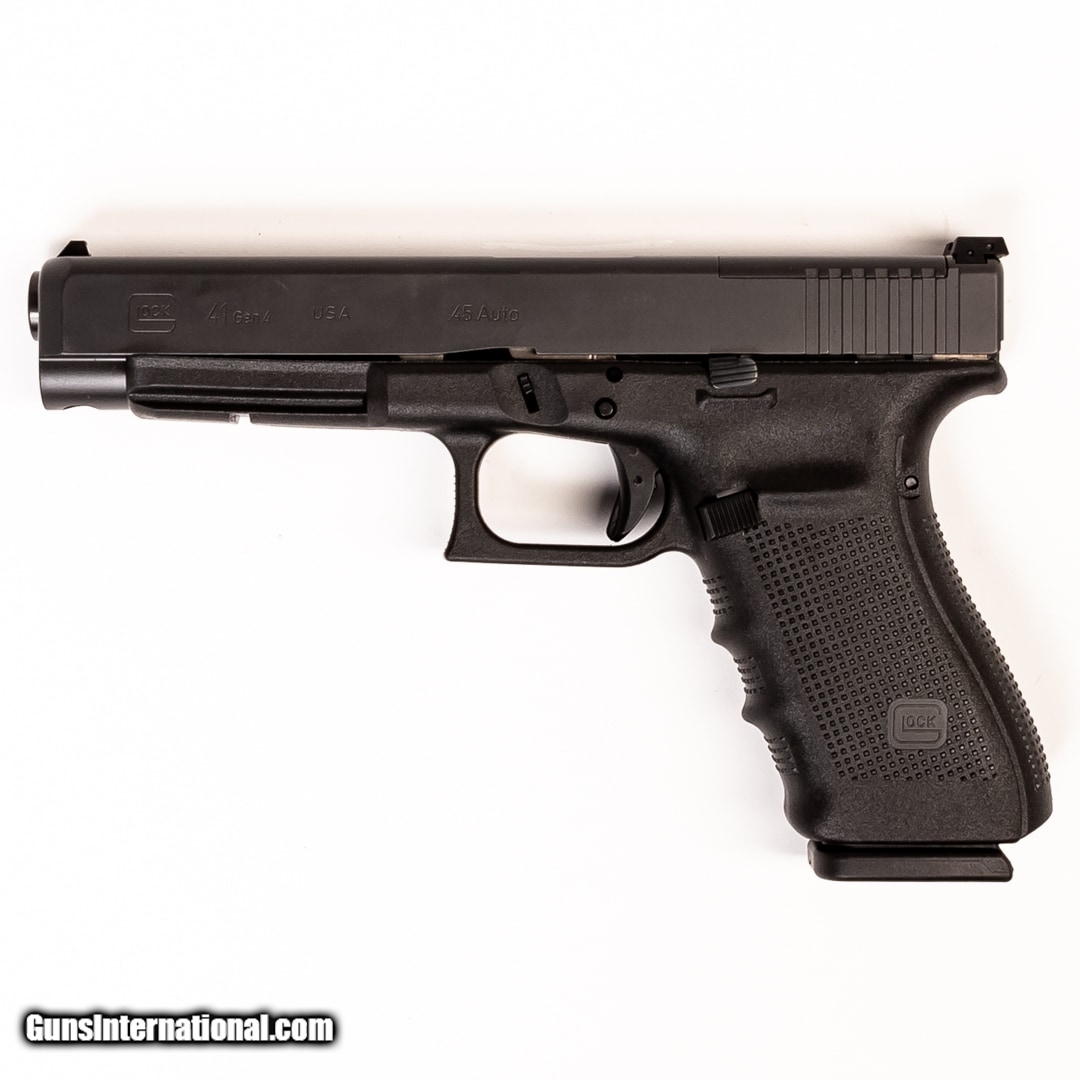 Description: Guns Listing ID: 421409 The Glock 21 is a full-size handgun chambered in 45 ACP. Perfect for duty use, self-defense, and tactical applications, the G21 has a legendary reputation for being solid and dependable. It features Glock‚‚s Safe Action Trigger and uses double stack magazines. This Glock G21 Gen 4 includes the original case, manual, three 13-round magazines, backstraps, loader, and a MOS adapter kit SOLD Manufacturer: GLOCK Model: G41 GEN4 Caliber Info: .45 ACP Condition: Used - Certified Barrels: 5.3 BARREL Finish: BLACK |