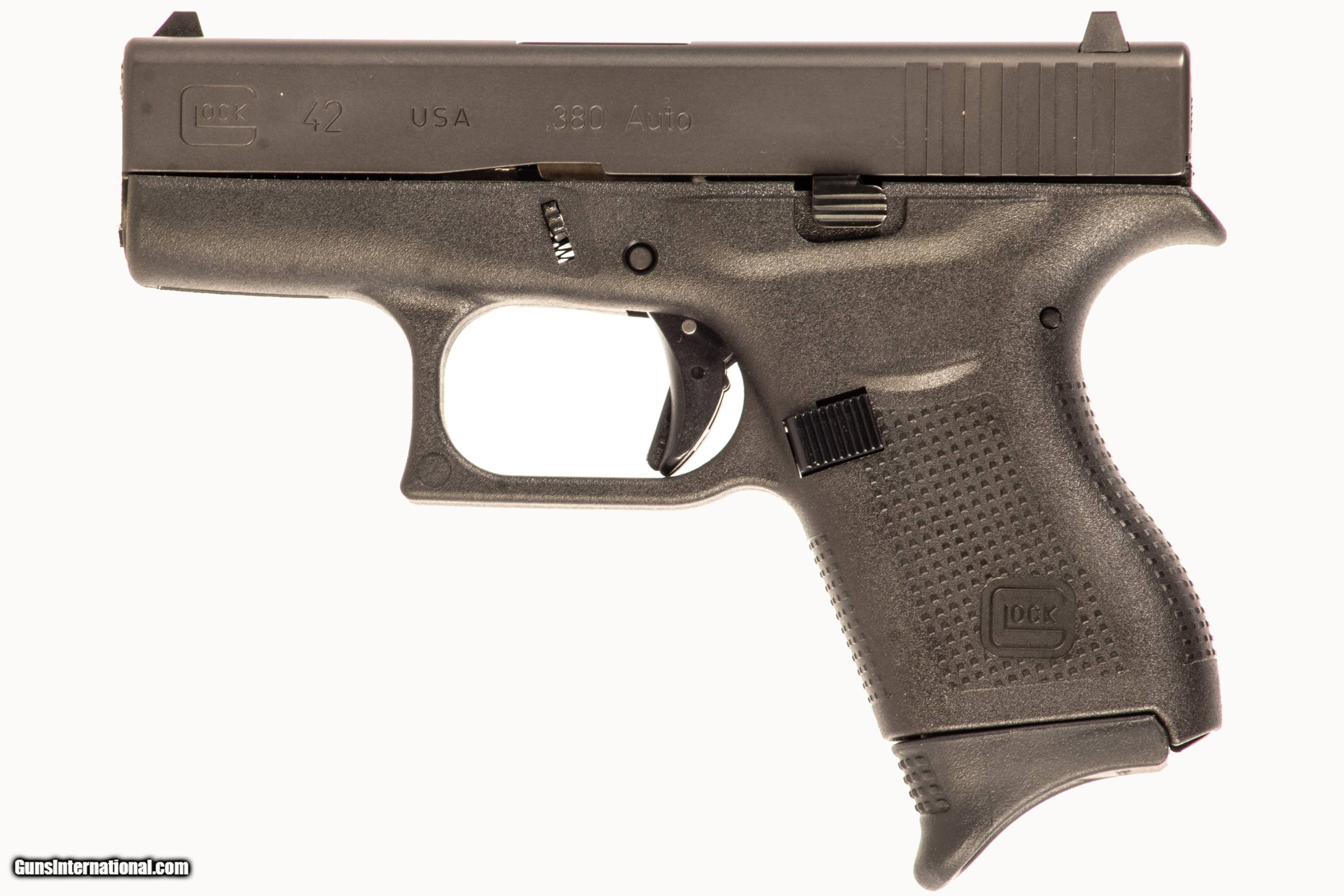 Description: Glock 42 chambered in 380 ACP with a 3 inch barrel bright & shiny bore case and 1 extra magazine. This is a used firearm that is in excellent condition and is covered by Dury's Lifetime Warranty.