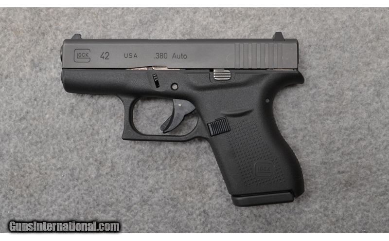 Description: Weighing in at 14 oz., this American made Glock 42 in .380 ACP sports a 3" barrel, traditional Glock sights, and polymer lower. Slide and barrel retain all their bluing and are in excellent condition. A couple of very light scratches noted on right side of slide. Bore is bright with good rifling. Polymer lower is in excellent condition. With an overall length of 6", this gun comes with the factory hard side case, paperwork, bore cleaning brush, and one extra magazine. .380 ACP SOLD Metal Condition: Slide is in excellent condition retaining full bluing. A couple of very light scratches noted on right-hand side. Wood Condition: Polymer lower is in excellent condition. Bore Condition: Bore is bright and shiny with good rifling. Barrels: 3.25" barrel. Stock Dimensions: 6" overall length. Weight: 14 oz. Sights: White dot front sight and white U shaped rear sight. Item Location: Mitchell, SD |