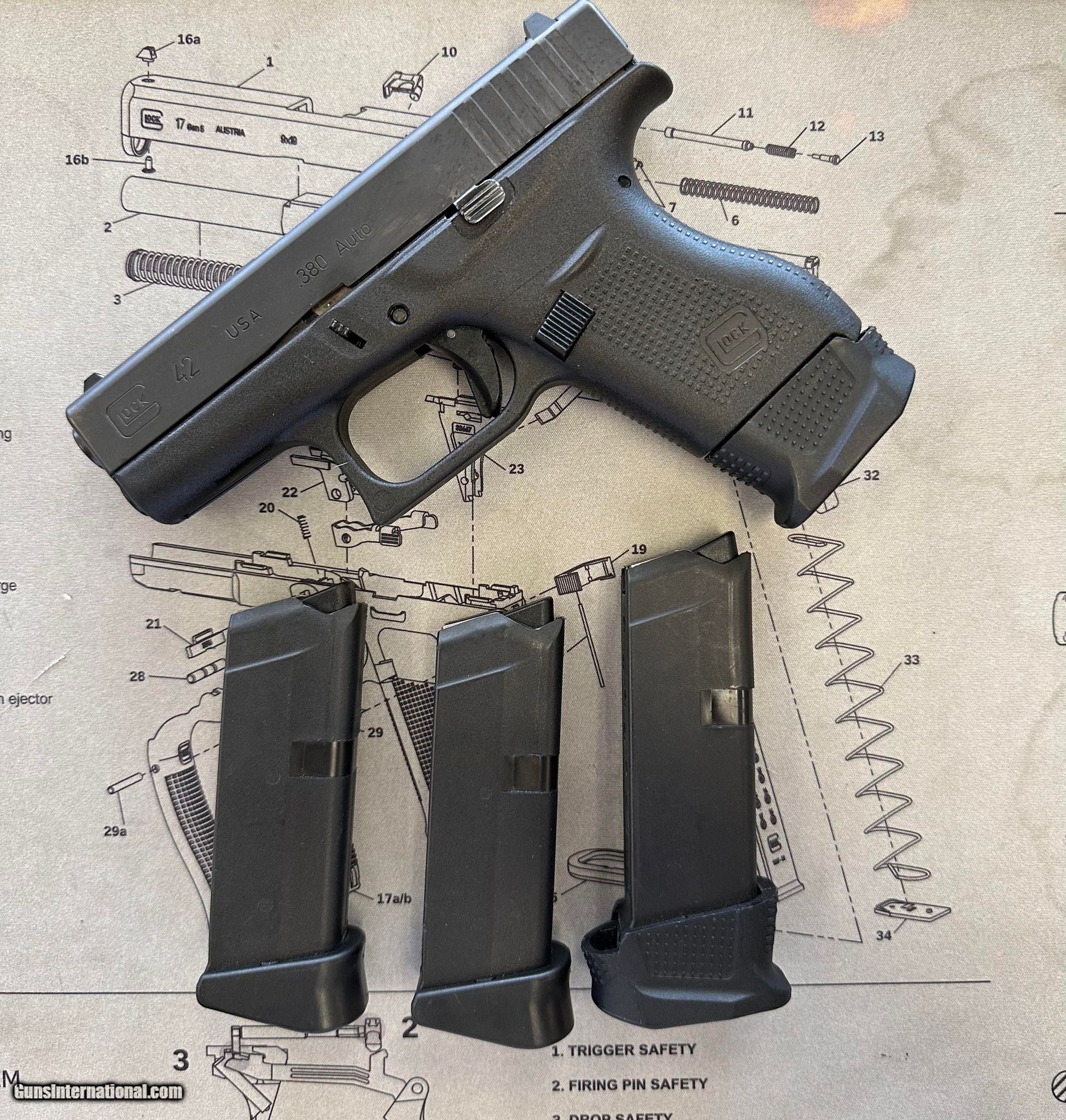 Description: Guns Listing ID: 1131451 Pistol does come with all the magazines that you see. 2 regular and 2 pinky extensions. Well maintained pistol, great for conceal carry for a lady with being .380ACP. No case. SOLD Manufacturer: GLOCK Model: 42 Caliber Info: .380 ACP Condition: Used - Non-Certified Barrels: 3.25 BARREL Finish: BLACK |