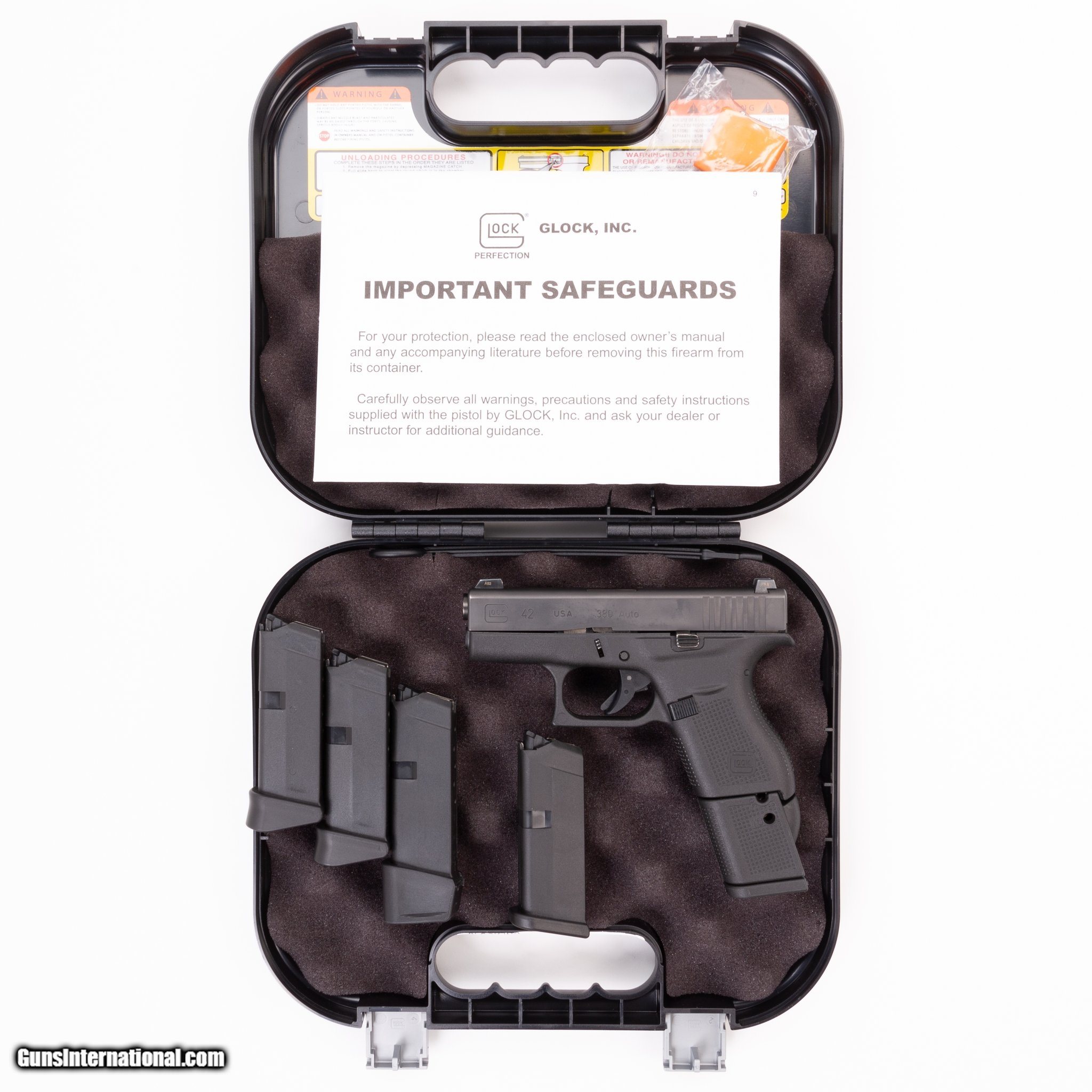 Description: Guns Listing ID: 398666 The original case, one 10-round magazine, and four 6-round magazines are included. Get the best bang for your buck when you get a Certified Used Firearm . When you see the Certified Used stamp on any of our firearms, you can be confident that you‚‚re getting exactly what you want – a gun only in very good to excellent condition and held to the highest quality standard. All Certified Used Guns come with a ‚‚no questions asked‚‚ return policy . PLUS, ALL CERTIFIED USED GUNS SHIP FR SOLD Manufacturer: GLOCK Model: 42 Caliber Info: .380 ACP Condition: Used - Certified Barrels: 3.2 BARREL Finish: BLACK Weight: 1 lbs. |
